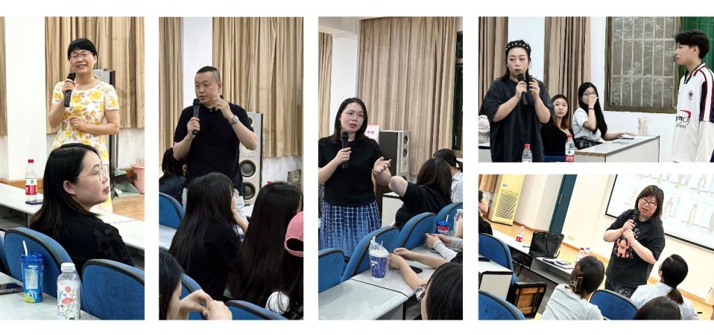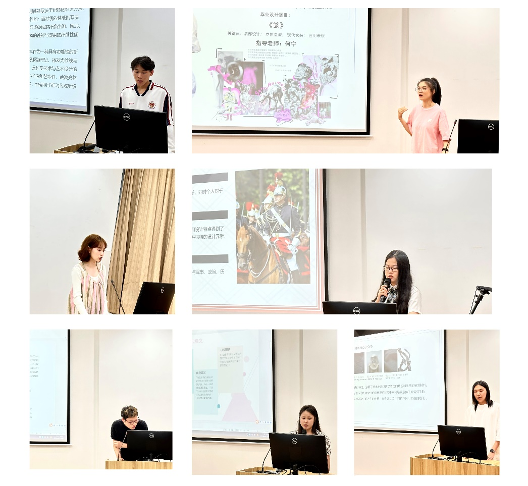 郑淏以《现代女装中功能性元素的创新设计应用》为题分享了对不同性质功能性设计的应用创新进展,梳理了功能性元素设计方法并在毕业设计中进行创新性实践。唐璐以《传统手工编织艺术在服装设计中的立体化表达》为题进行分享,将传统手工编织应用在毕业设计中,实践其在服装设计中的运用。万威以《基于有机廓形的创意羽绒服装设计实践》为题介绍了羽绒服装的设计原理,探讨有机廓形在羽绒服装设计中的实践价值。张瑀萱就《肩部造型设计在现代女装中的应用》从理论结合设计实践探讨了肩部造型设计提升作品多样创意性途径。