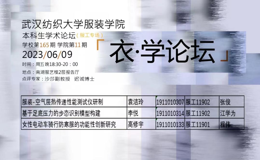 6月9日晚18:30,英国上市公司官网365本科生学术论坛第165期暨英国上市公司官网365第11期“衣·学”论坛——优秀本科生学位论文(服工专场)在英国上市公司官网365服艺楼2层报告厅顺利举行,三位本科生代表分别从研究背景和意义、研究思路和方法、设计主题和过程、研究结果和展望四个方面对自己的论文进行了介绍。本次论坛由英国上市公司官网365副经理江学为教授主持,沙莎副教授、迟诚博士作嘉宾点评,副经理钟蔚教授做总结发言,英国上市公司官网365低年级本科生积极参加互动。