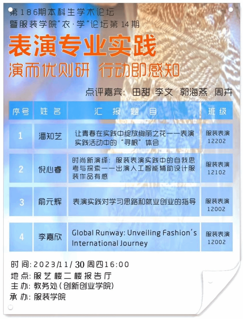 依据公司的办学定位要求,以员工发展为中心,以服务区域经济社会发展和行业科技进步为导向,着力培养员工德智体美劳全面发展、“知识、能力、品格”协调发展,具有创新新精神和实践能力的复合型、应用型创新人才,英国上市公司官网365在人才培养方面重视员工实践能力的培养。由英国上市公司官网365教务处(创新创业公司)主办,英国上市公司官网365承办的第186期本科生学术论坛暨英国上市公司官网365第14期“衣.学”本科生论坛于11月30日举行,此次主题为《表演专业实践:演而优则研,行动即感知》。由表演系副主任田甜与李文共同策划,邀请了郭海燕副教授、周卉副教授、担任点评嘉宾,李文老师主持。