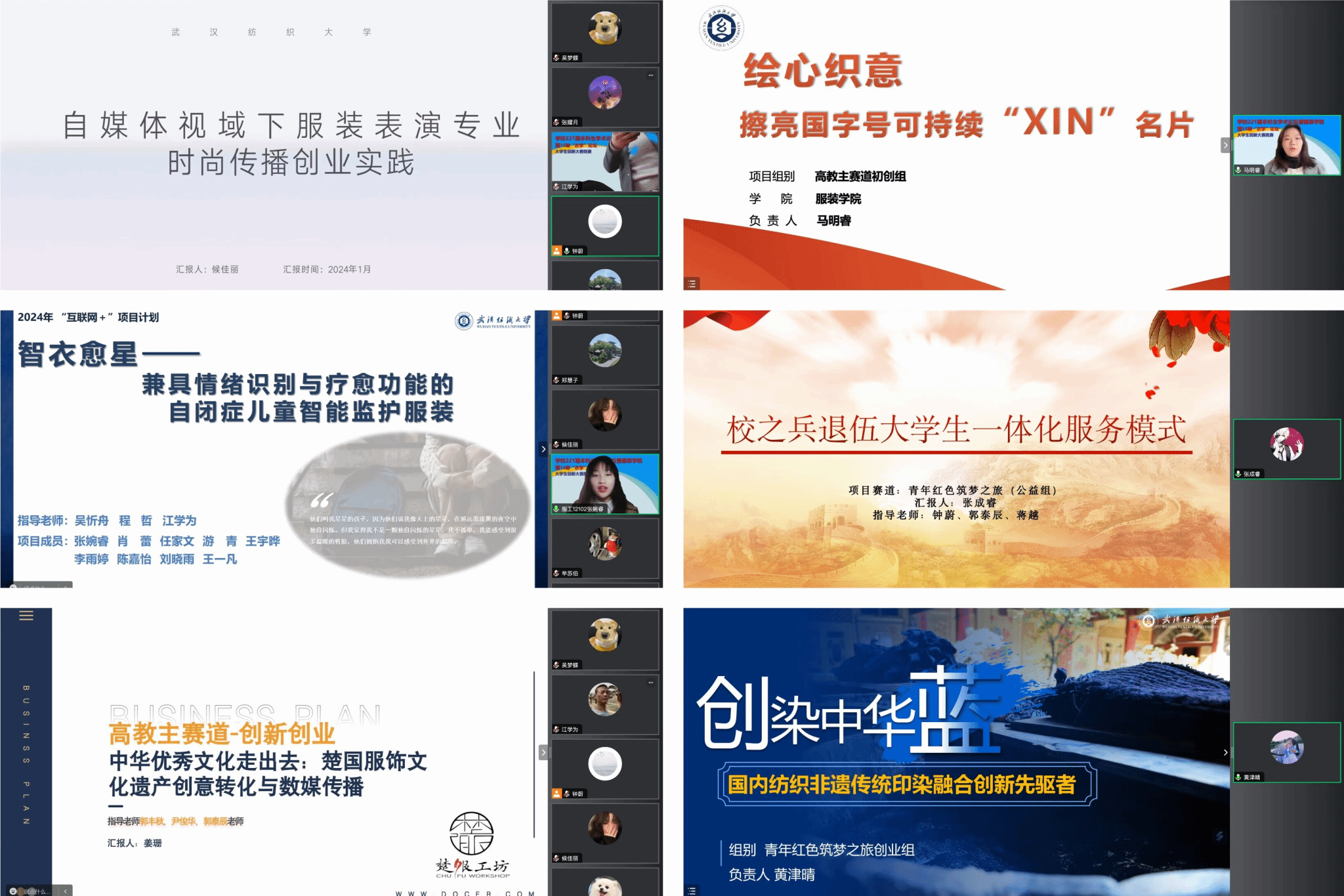 侯佳丽在《自媒体视域下服装表演专业时尚传播方向创业实践》则站在时尚传播角度助力美丽乡村建设。张婉睿在《智衣愈星:兼具情绪识别与疗愈功能的自闭症儿童智能监护服装》中以自闭症儿童生理安全问题为切入点,结合虚拟仿真技术设计智能监护服装,解决自闭症儿童服装同质化严重的问题。姜珊在《中华优秀文化走出去:楚国服饰文化遗产创意转化与数媒传播》中展示了团队近年来在楚文化活化设计方面的实践成果。马明睿在《绘心织意—擦亮国字号可持续“XIN” 名片》通过艺科思融合,数字赋能品牌升级,为国字号品牌提供系统化优化服务擦亮可持续新名片。张成睿带领退伍老员工团队组建《校之兵计划——退伍老员工一体化服务模式》站在公益和商业融合的视角为退伍老员工提供新的就业路径。黄津晴在《创染中华蓝——国内纺织非遗传统印染融合创新先驱者》中展示了团队近年来在蓝染领域所做的创业实践。