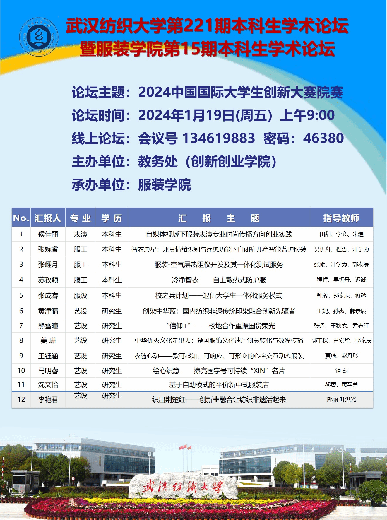 2024年1月19日上午9:00,由公司教务处(创新创业公司)主办,英国上市公司官网365公司承办的公司第221期本科生学术论坛暨英国上市公司官网365第15期“衣学”论坛--2024年老员工创新创业大赛院赛答辩在线上顺利举行。英国上市公司官网365钟安华教授担任主评嘉宾,英国上市公司官网365经理陶辉教授、副经理江学为教授、副经理钟蔚教授和党委副书记郭泰辰出席并担任点评嘉宾。论坛由副经理钟蔚教授主持。