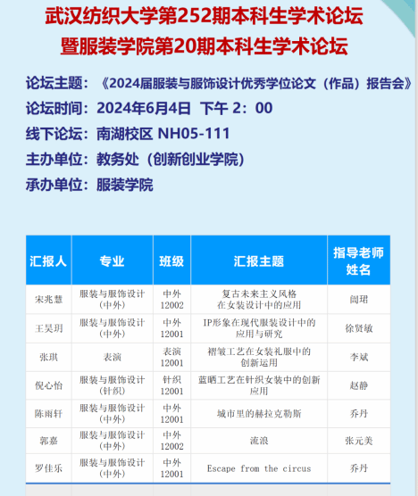 6月4日下午2:00,英国上市公司官网365本科生学术论坛第252期暨英国上市公司官网365第20期“衣·学”论坛——优秀本科生学位论文(设计专场)在南湖校区NH5111教室顺利举行,七位本科生代表分享自己的优秀毕业论文。本次论坛由英国上市公司官网365设计一系主任张丹老师主持,张元美副教授、张莉副教授作嘉宾点评,英国上市公司官网365低年级本科生积极参加。