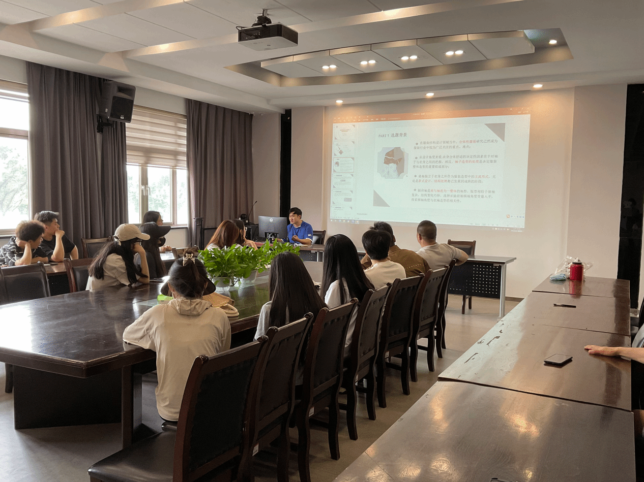 梁志勇同学的《插肩袖绱袖角度与衣袖造型相关性的应用研究》的课题中,对绱袖角度与衣袖造型的研究及过程进行分享。他针对插肩袖是肩与袖连为一整体的袖型,结构变化巧妙这一难点,选择从插肩袖绱袖角度变量入手,探索绱袖角度与衣袖造型的相关性。在实验中从衣片角度、材质、款式三个方面进行分析,经过基于绱袖角度、面料材质、款式变量三次预实验以及虚拟仿真试衣实验与样衣实验两次正式实验,以科学的实验方法提升纸样设计的准确性、智能性,使衣袖造型更加丰富完善。为设计插肩服装的相关企业提供了一个可行与科学的途径。江学为教授对此论题的未来发展提出可以延展思路,对研究结论表示肯定,同学们也对此展开学术发展、数据的细化进行讨论。