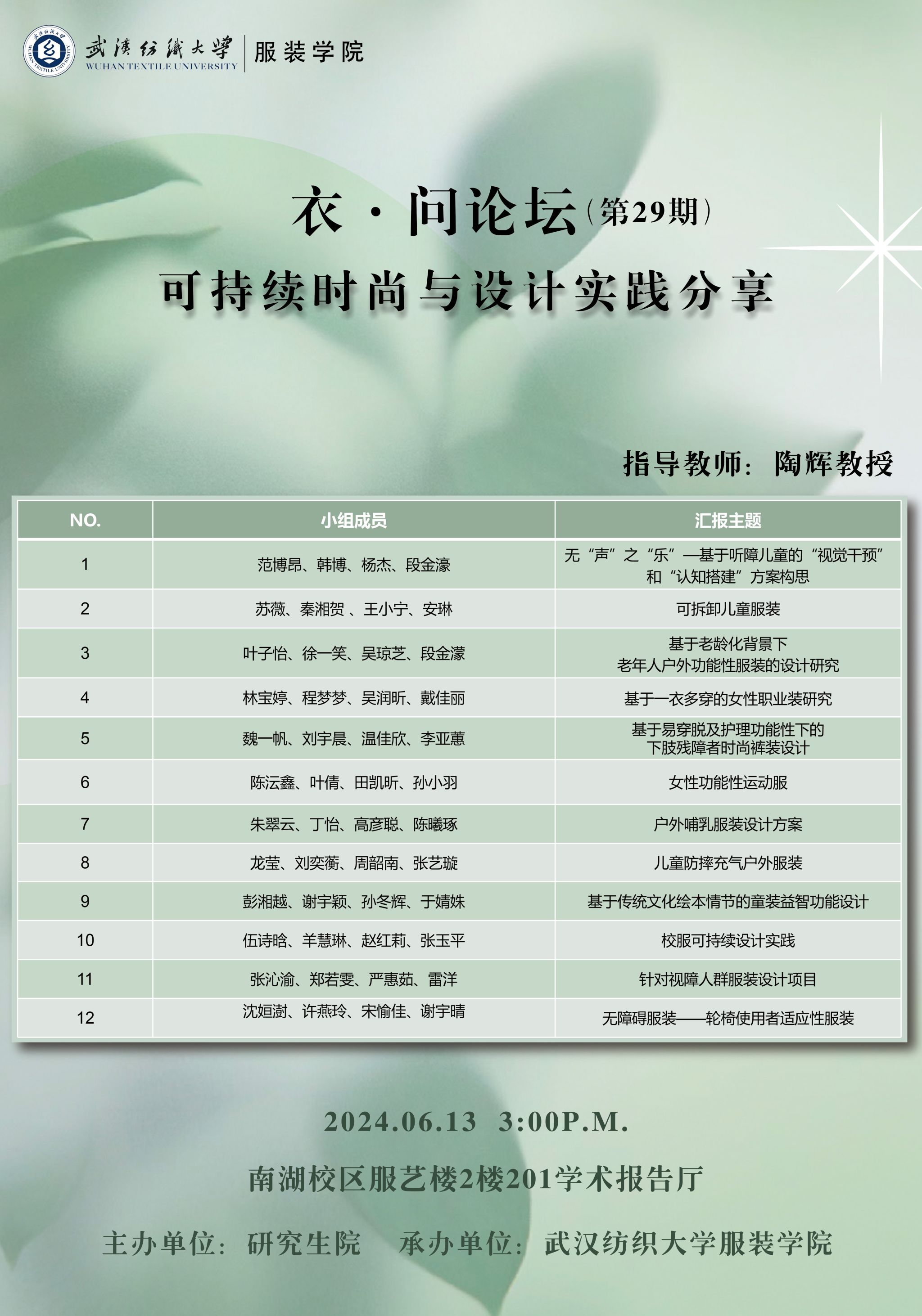 本次汇报共划分为十二个小组,并在论坛上逐一分享了他们的研究成果。这不仅是一次学术的交流与碰撞,也是同学们对时尚可持续发展理念的生动诠释。