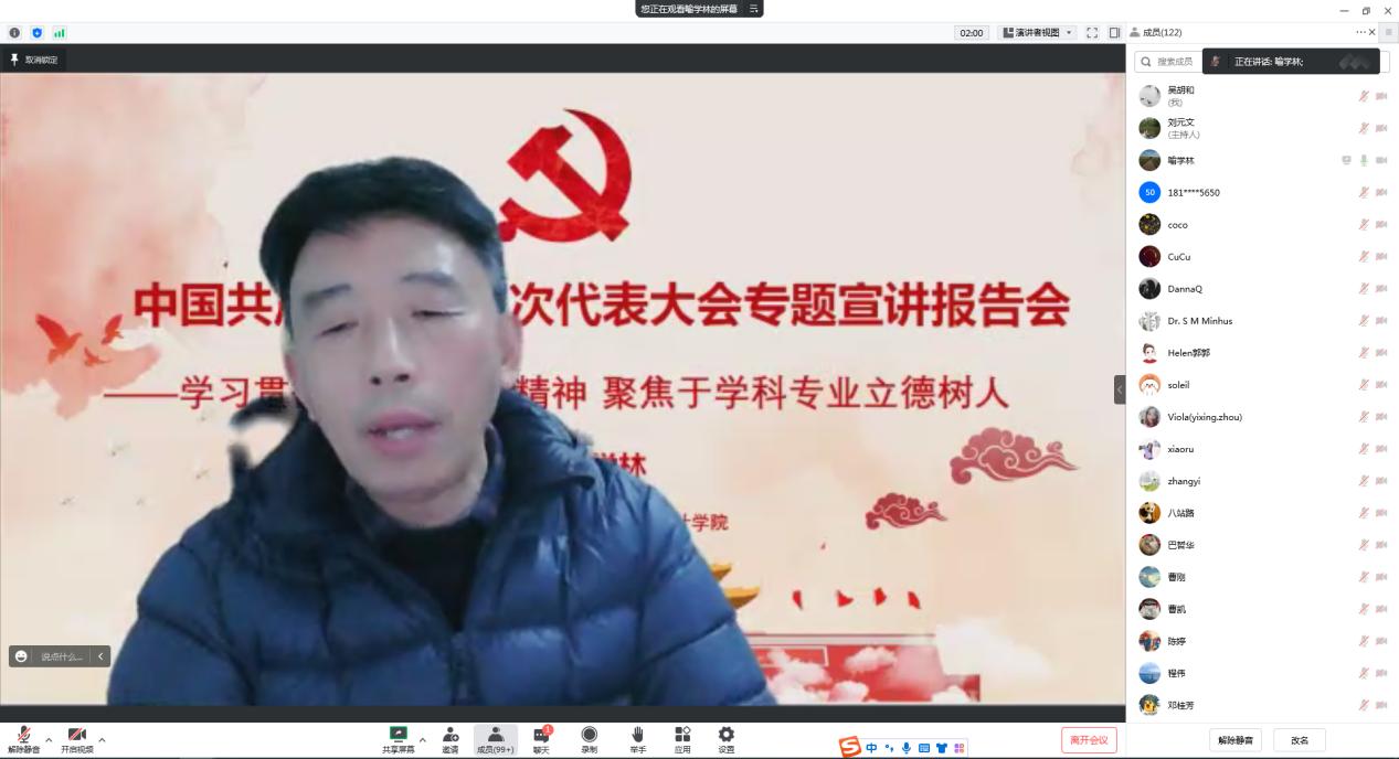 报告会邀请校宣讲团成员,马克思主义公司喻学林教授作辅导报告。喻学林以《学习贯彻党的二十大精神,聚焦于学科专业立德树人》为题,从党的二十大报告的主要内容七个主要的理论创新以及聚焦艺术学科立德树人个方面用生动的语言,案例对比分析对党的二十大精神进行全面解读和深入阐释,启发和帮助广大教师进一步深刻领会,准确把握党的二十大精神的思想精髓和核心要义。最后,喻学林结合湖北的科教优势重点实施五大行动以及两个公司的优势分析了发挥艺术学科在时代创新中的价值