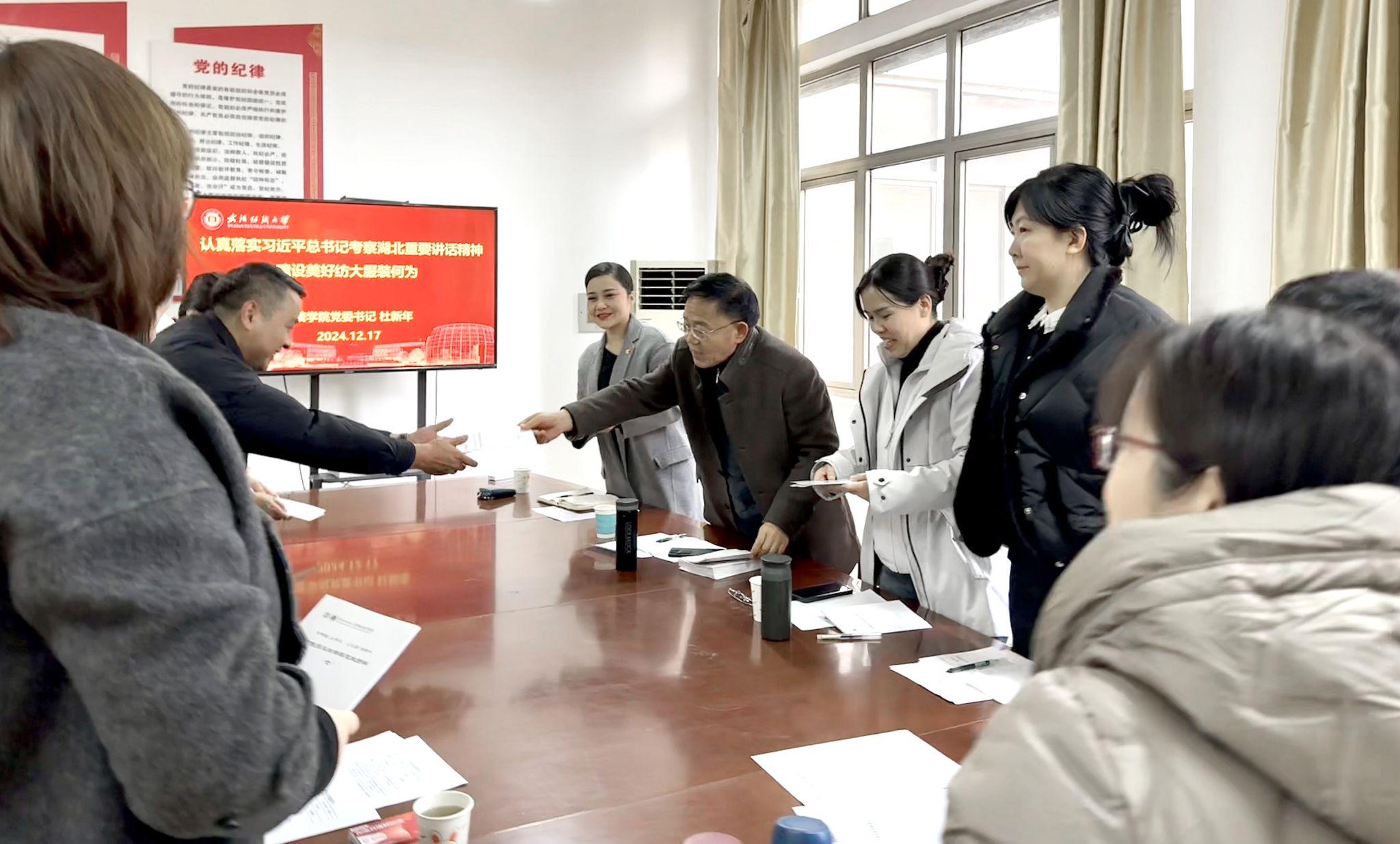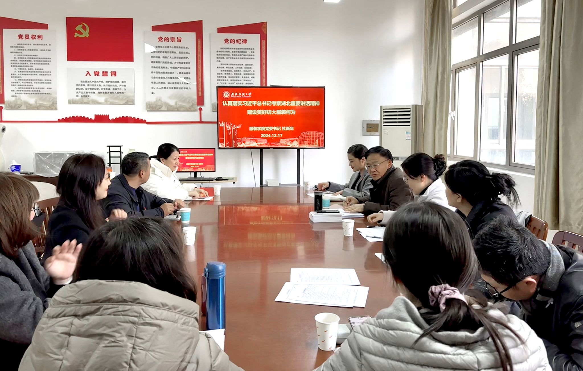 杜新年首先对服装设计教师党支部入选全省高校“双带头人”教师党支部书记“强国行”专项行动团队表示祝贺。带大家回顾习近平总书记11月份再次来到湖北时的重要讲话精神,习近平总书记对楚文化、非遗文化传承等方面做了重要指示,结合服装公司专业特色和党员教师的研究方向,围绕不断挖掘和深化传统服饰文化当代转化、参与跨文化沟通和国际理解教育、提升专业服务和教育服务等方面的落实路径展开分析。鼓励各位党员教师秉承“崇真尚美”校训,科学上求真,人文上求美,自觉投身国家发展建设之中,努力培养员工立大志、明大德、成大才、担大任的时代新人的使命担当。杜新年叮嘱大家,要把学习宣传贯彻习近平总书记考察湖北重要讲话精神作为一项长期的重大政治任务,学深悟透精神实质,不折不扣抓好落实,牢记殷殷嘱托,为加快建成中部地区崛起的重要战略支点,奋力谱写中国式现代化湖北篇章贡献智慧和力量。