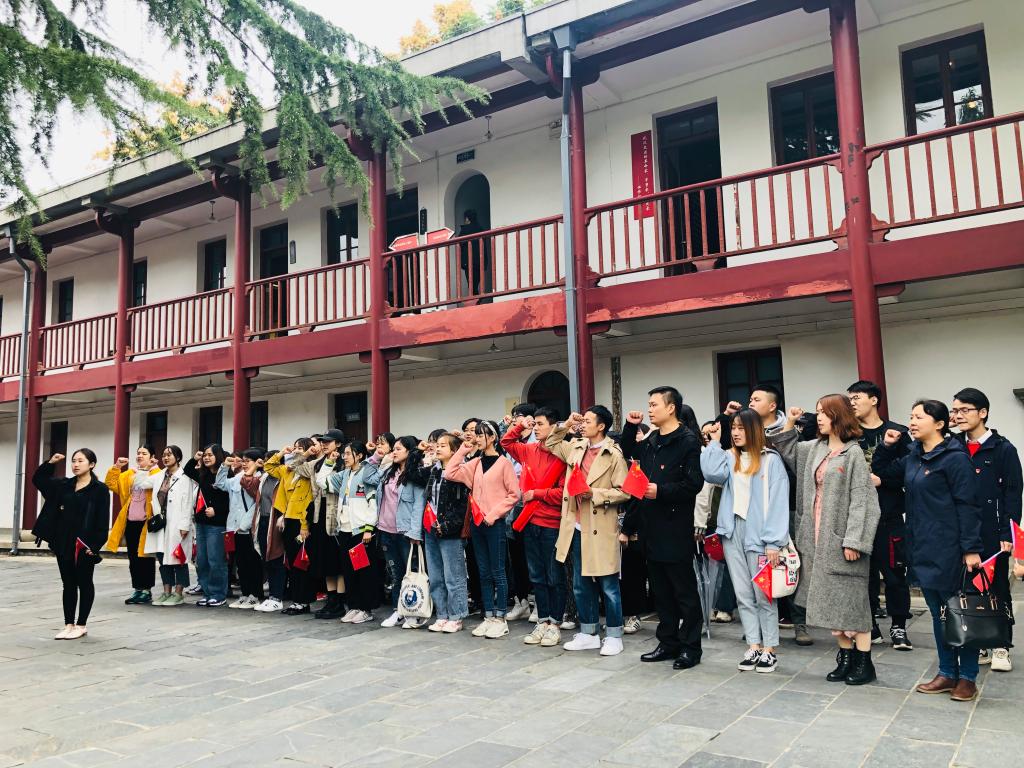 在中共五大会议旧址纪念馆,员工党员代表黄茹倩同学带领全体党员重温入党誓词。全体党员以坚定有力,铿锵有秩的信念和决心,在旧址庄严宣誓:“我志愿加入中国共产党,拥护党的纲领,遵守党的章程......”