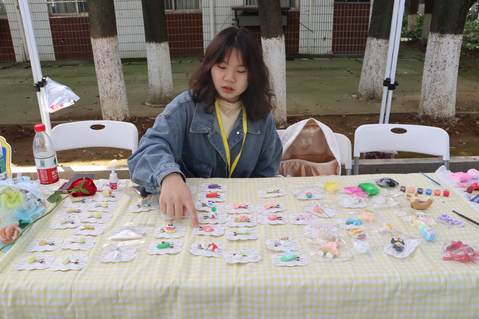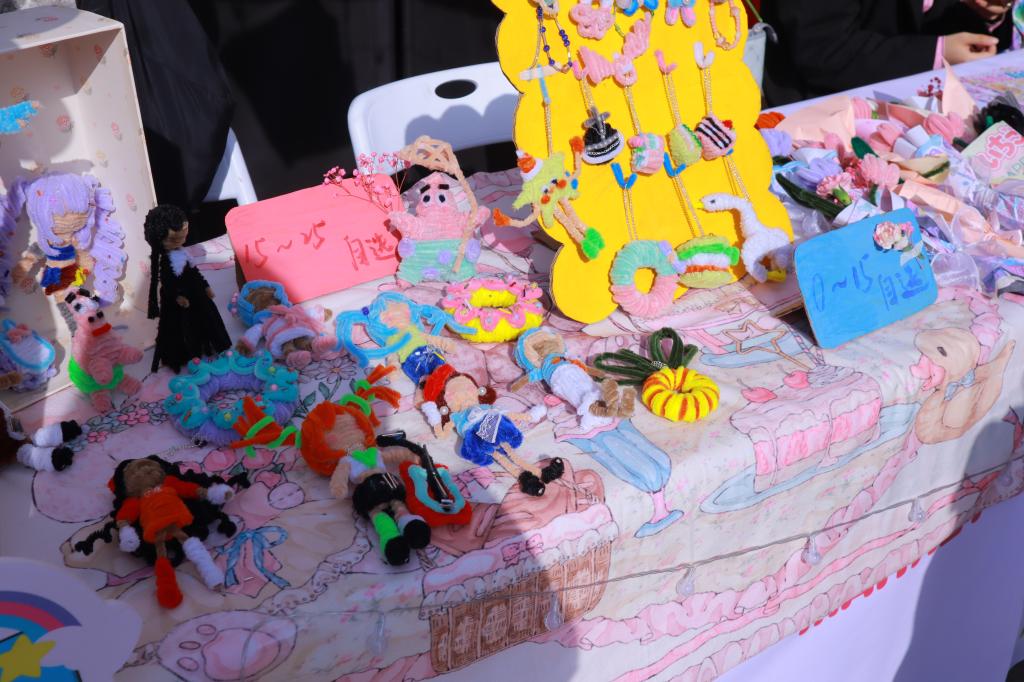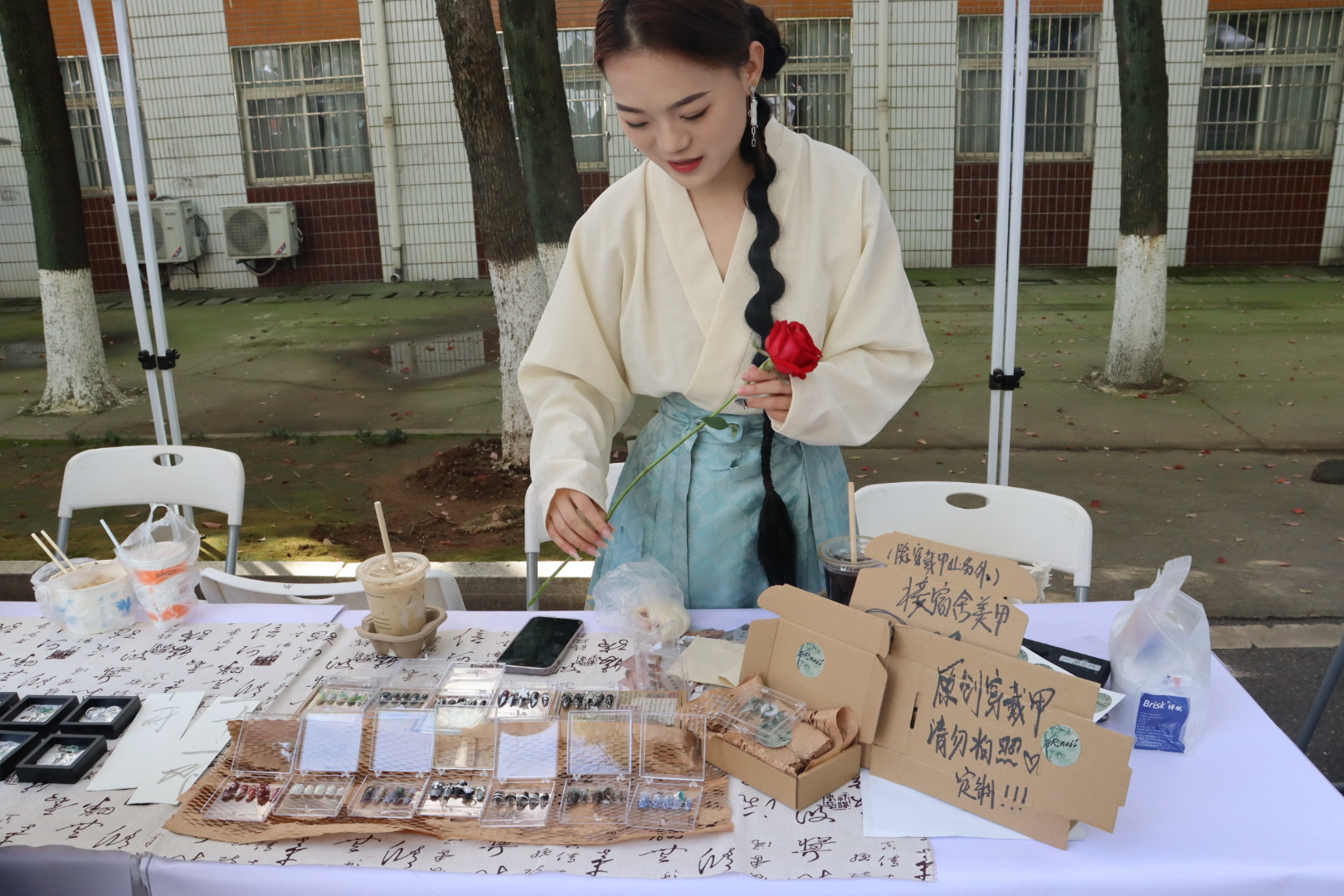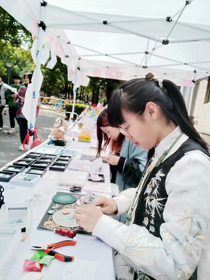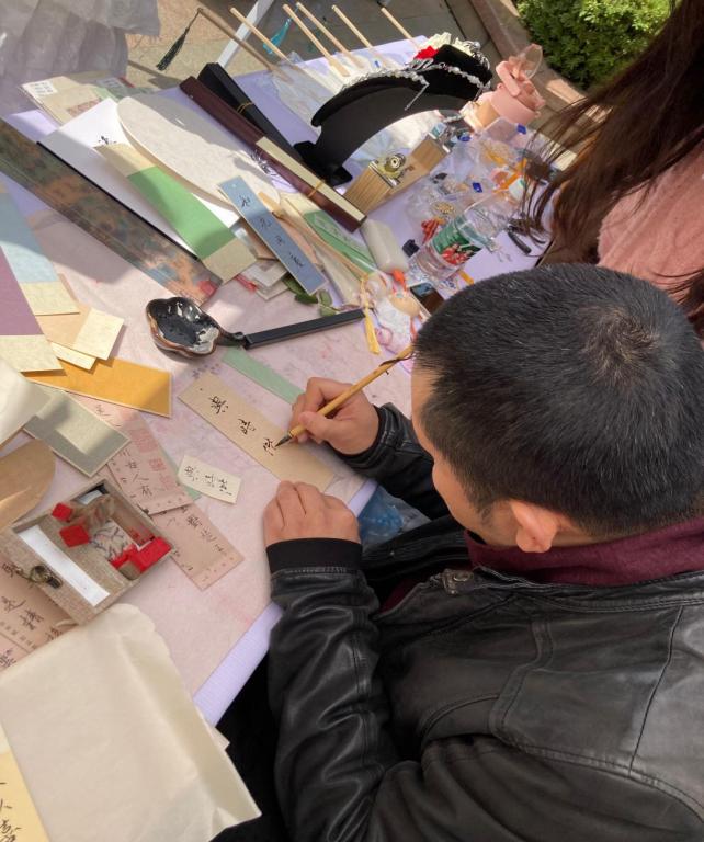 7号书法摊上,两位摊主售卖着端正秀逸的文创作品如书签和扇子。她们还邀请老师展示书法,引得大家围观和赞美,师生打成一片其乐融融。