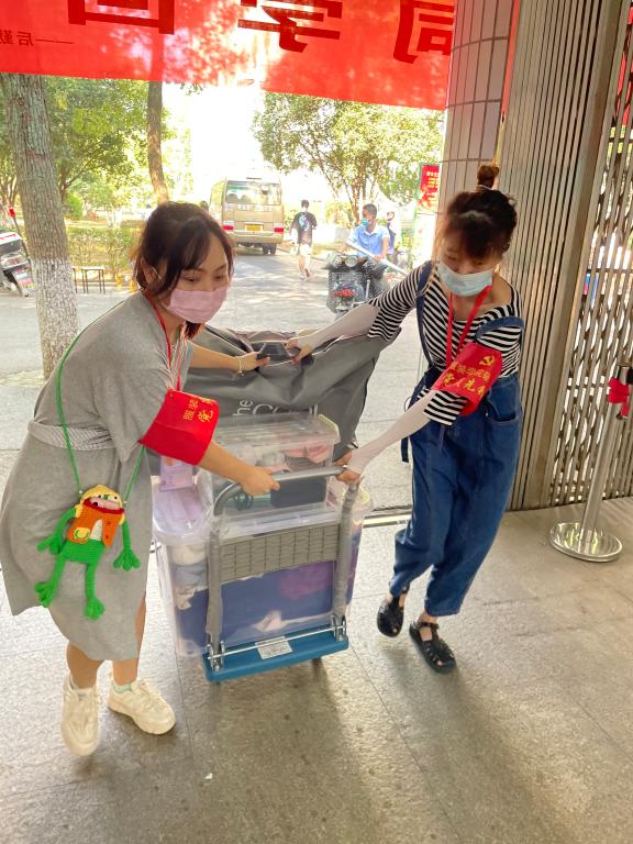 在一区宿舍迎新点,研究生党员志愿者们帮助新生们搬运行李、办理入住手续等事宜,解决新生入校“最后一公里“难题,让初入校园的新生们倍感温暖。
