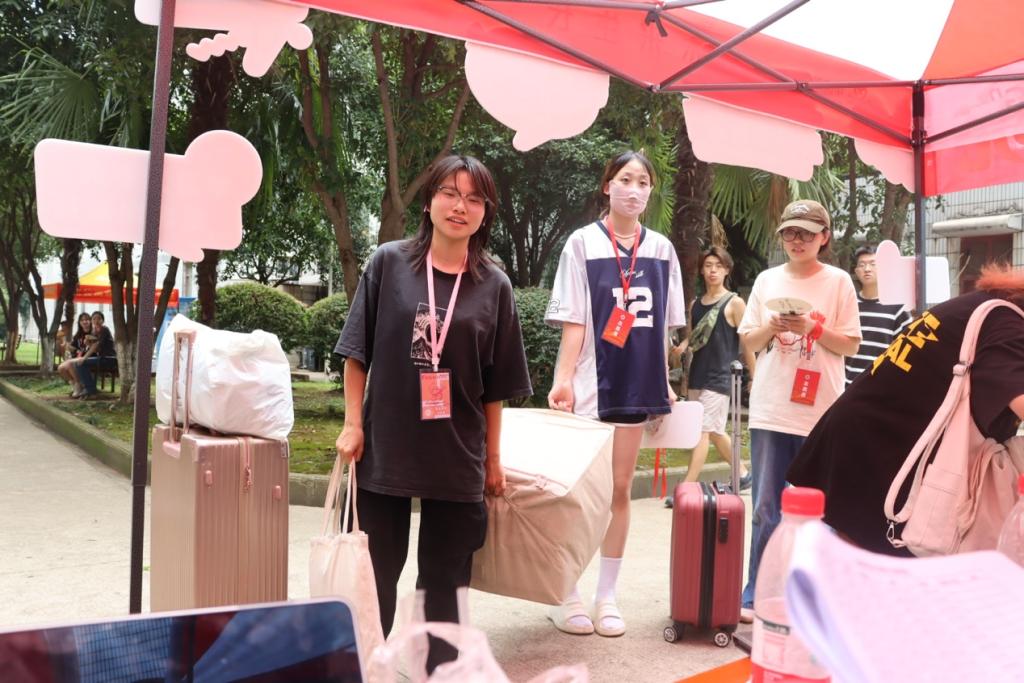 在接驳车点,志愿者们举着公司牌子迎接新生;在迎新点,志愿者们为新生发放礼包并完成报到手续;在宿舍楼下,志愿者事无巨细的为新生和家长们讲解办理手续和入住注意事项;在穿行的人行中,志愿者们肩扛手拎新生的行李,成为一道靓丽的风景线。
