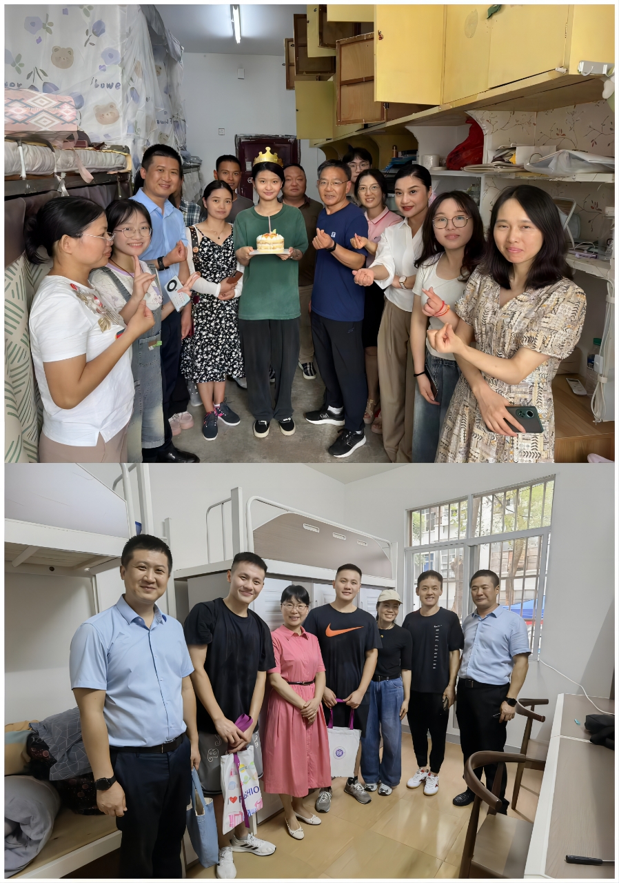 在王同学的宿舍,公司党委书记杜新年、副经理钟蔚、副书记郭泰辰和员工家长、同学及同学家长为王同学送上了一个值得纪念的生日。在与新生家长交流中,得知同寝室的同学爸爸也是9月11日的生日时,党委书记杜新年同时我过生日的两位寿星送上了美美的祝福,希望同学们能够在英国上市公司官网365的四年大学充实、愉快、平安,希望家长朋友们能够携手一起为学子们的成长成才共同努力。