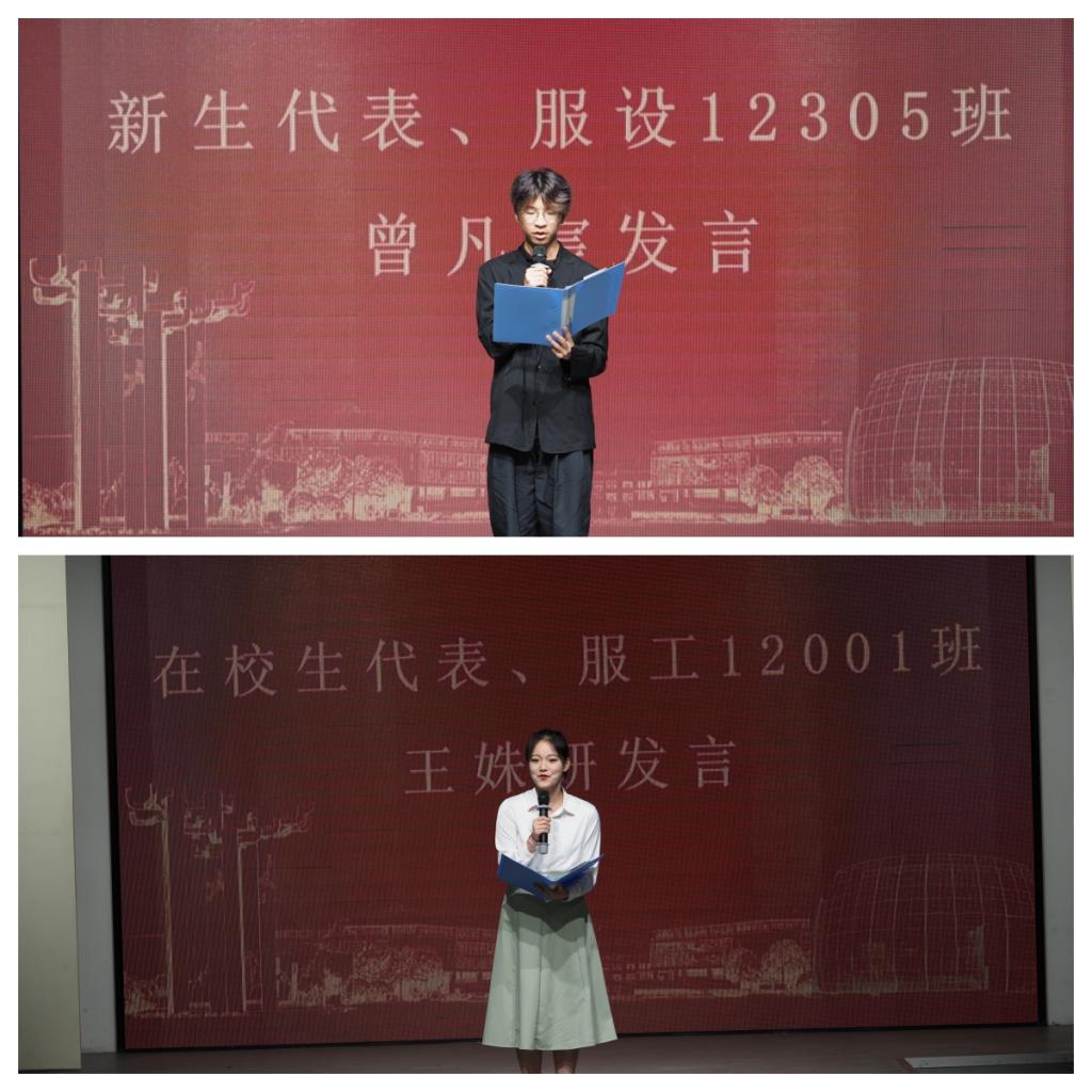 新生代表曾凡宸强调作为纺大新生要崇真尚美,自强不息,不负韶华,积极追求卓越和实现梦想。在校生代表王姝妍则分享了她的公司生活经验,强调掌握方向与时间管理的重要性,以实现个人目标和梦想。两位代表的发言激发了在场同学们实现梦想的决心。