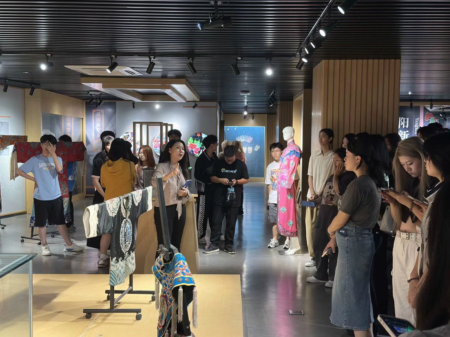 非遗馆的工作人员对同学们的参观表示了热烈的欢迎,在参观过程中工作人员向同学们详细了古代纺织工艺“织”“染”“绣”的历史发展脉络与内涵,并且向新生讲解了绞缬(扎染)、蜡缬(蜡染)、夹缬(夹染)等工艺。同时还向新生们展示了各种由传统工艺需要的工具及其制成的布料与成衣。同学们通过与土家织锦、大悟织锦带、天门蓝印染技艺等非遗文化的近距离接触无不表现出对些传统文化的兴趣与惊叹,纷纷赞叹这片大地上劳动人民的智慧与那精湛的手艺。