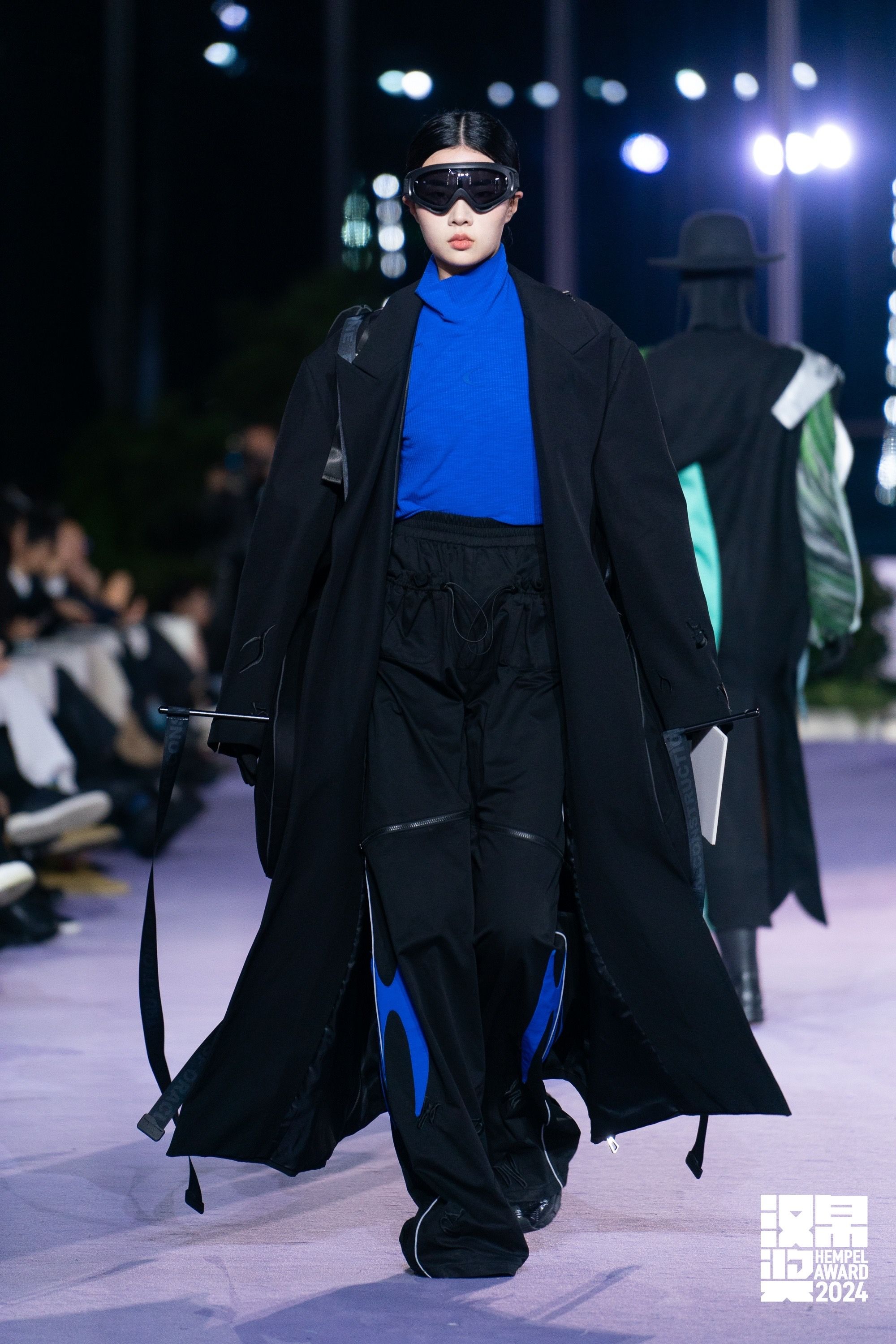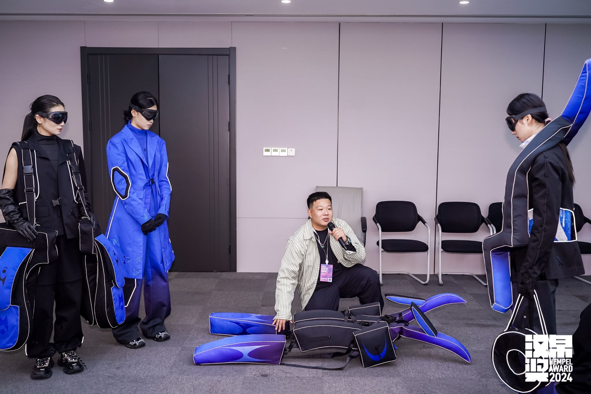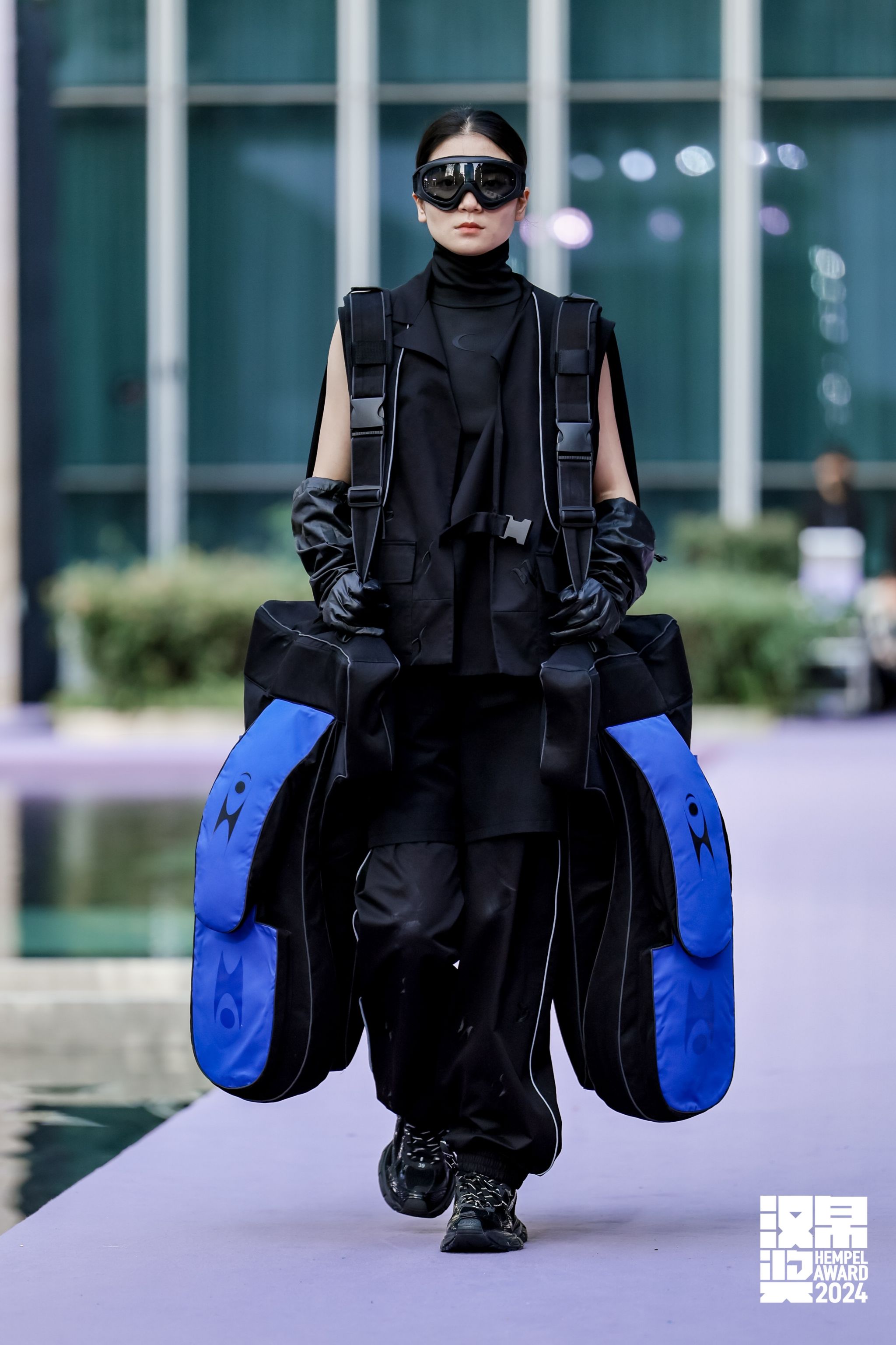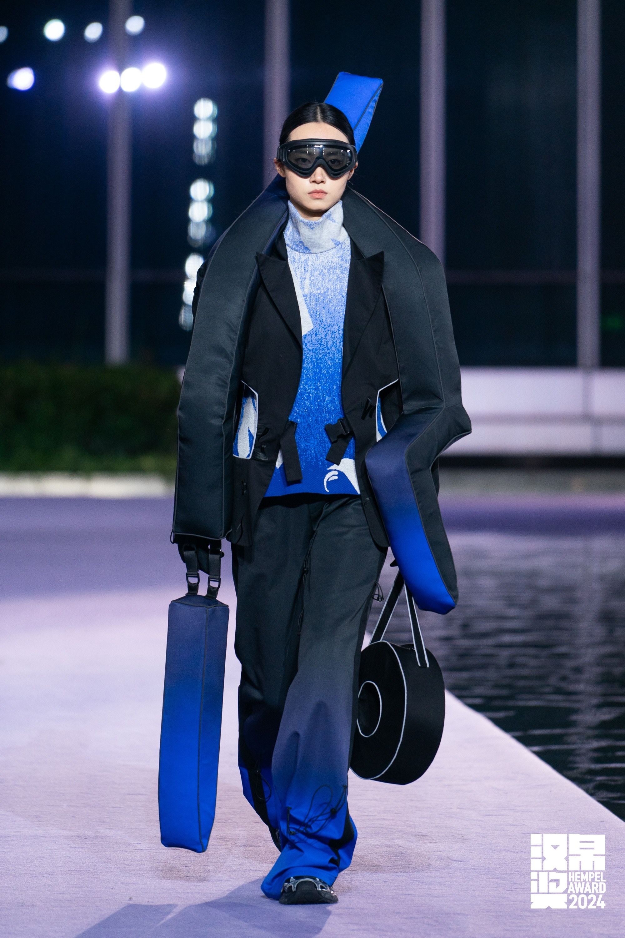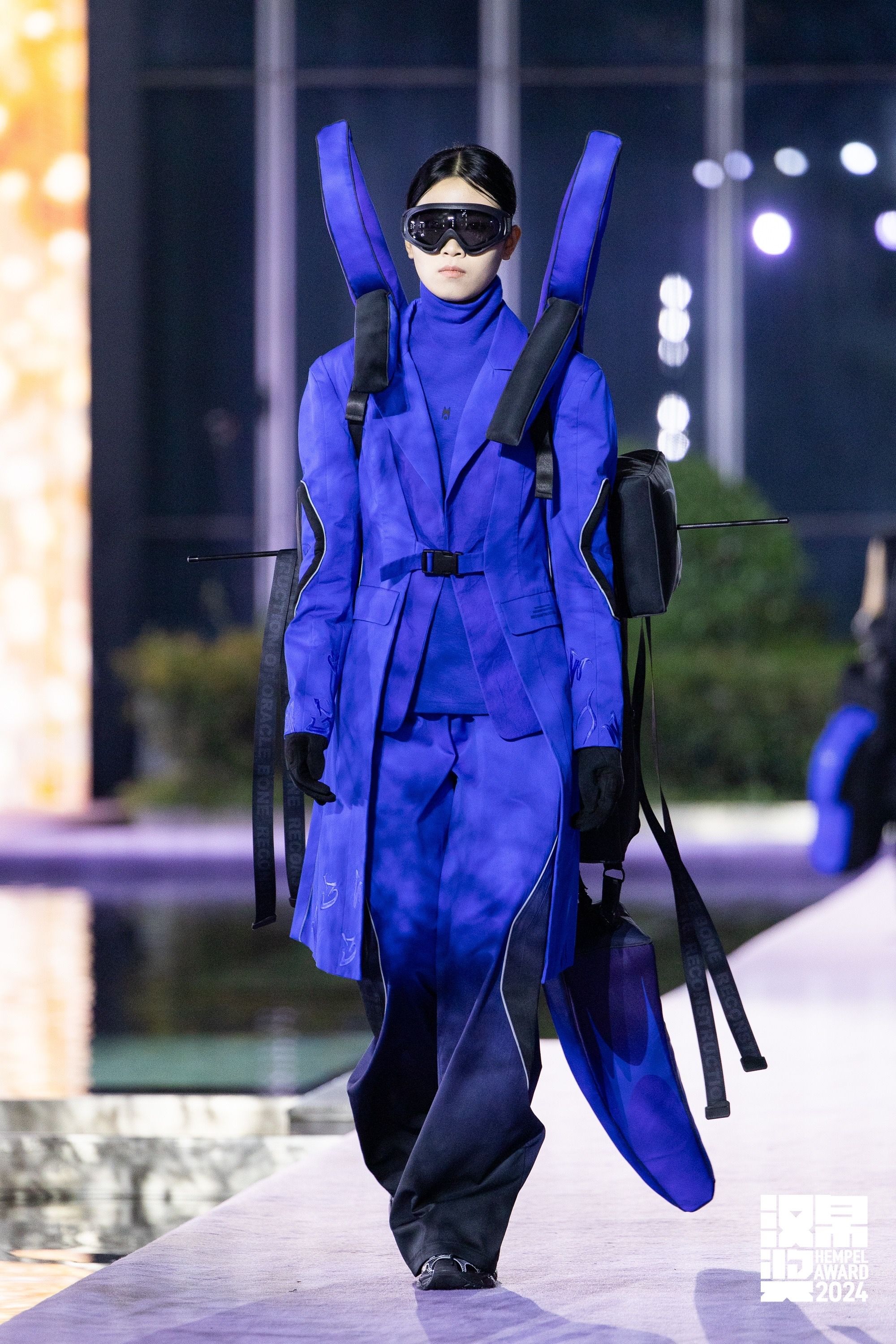 此次获奖作品《再造·甲骨》的灵感来源于甲骨文,在款式设计上去突显服装的交互 ,去连接在那个时代撰写者的思想,让人成为一个载体去探讨时装与古人之间的关系和互相传递的情感价值。 通过对甲骨文字体结构和符号演化的研究,将二维平面字体转化为立体服装装置融入此次系列的各个细节之中(抽象化处理转化为服装装置的轮廓)。四套装置里面都采用了可持续可降解的聚乳酸充气材料 ,在面料上选择棉质风衣面料 柔软细腻,透气舒服,不易起静电。同时采用刺绣及针织工艺在服装上体现涂鸦字体,去链接中西方字体文化的交流。整体色调采用黑色与克莱因蓝两种颜色,去传达一种深邃的神秘感 。