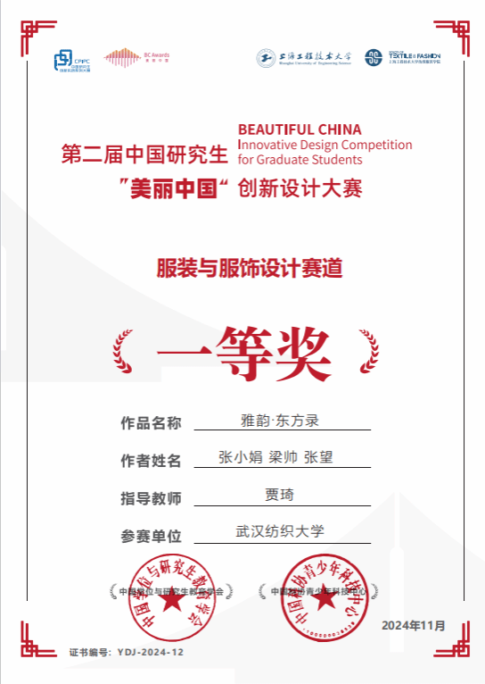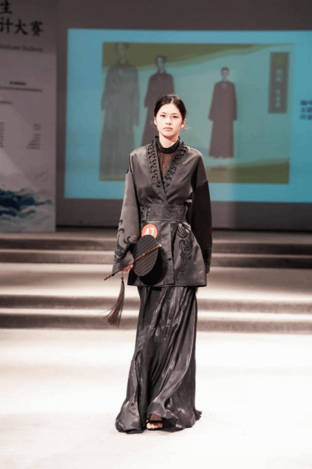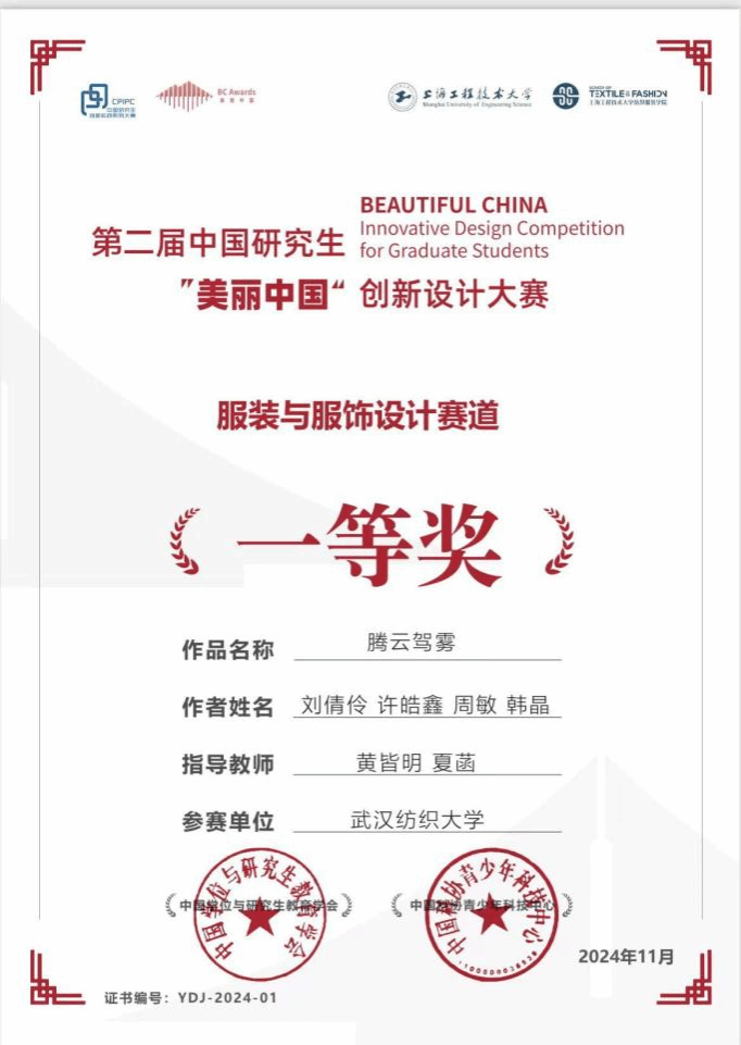 荣获全国一等奖的“早点睡队”团队作品《雅韵东方录》,以新中式服装设计融合华中文化精髓,采用现代剪裁与传统元素,结合先进图案技术,选用缎面与金银丝复合面料,展现层次与光泽,体现出东方美学下的人与服装的关系,彰显东方美学。