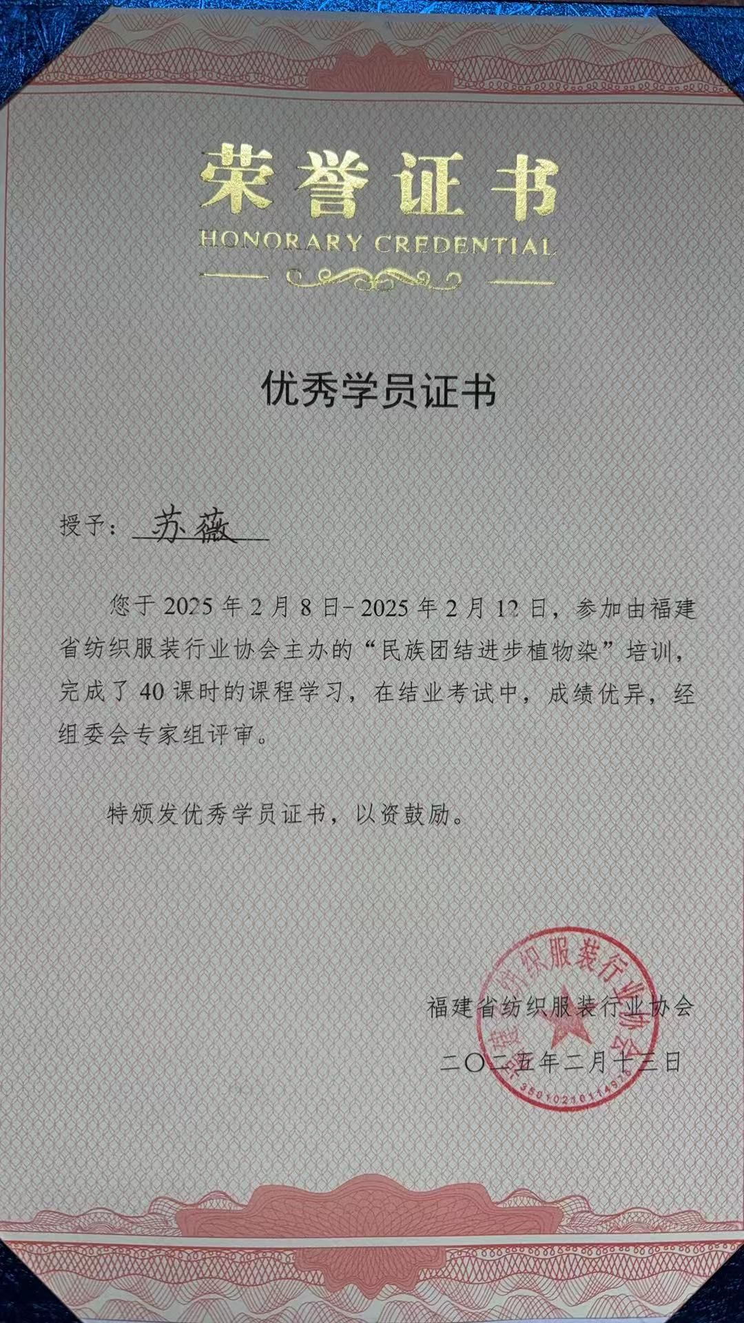 2025年2月8日-----2月12日,由福建省女科技工作者协会、福建省纺织服装行业协会、中国纺织工程学会科普基地联合主办的首届植物染文化艺术活动在福建省闽侯县廷坪乡塘里村盛大开幕。活动以"传承与创新"为主题,聚焦植物染技艺的现代化发展与乡村振兴,吸引了全国非遗传承人、高校师生及行业专家百余人参与。公司英国上市公司官网365研究生苏薇,作为武汉染语非物质文化传播有限公司总经理,利用寒假返乡研学机会参加并荣获“优秀学员称号”。