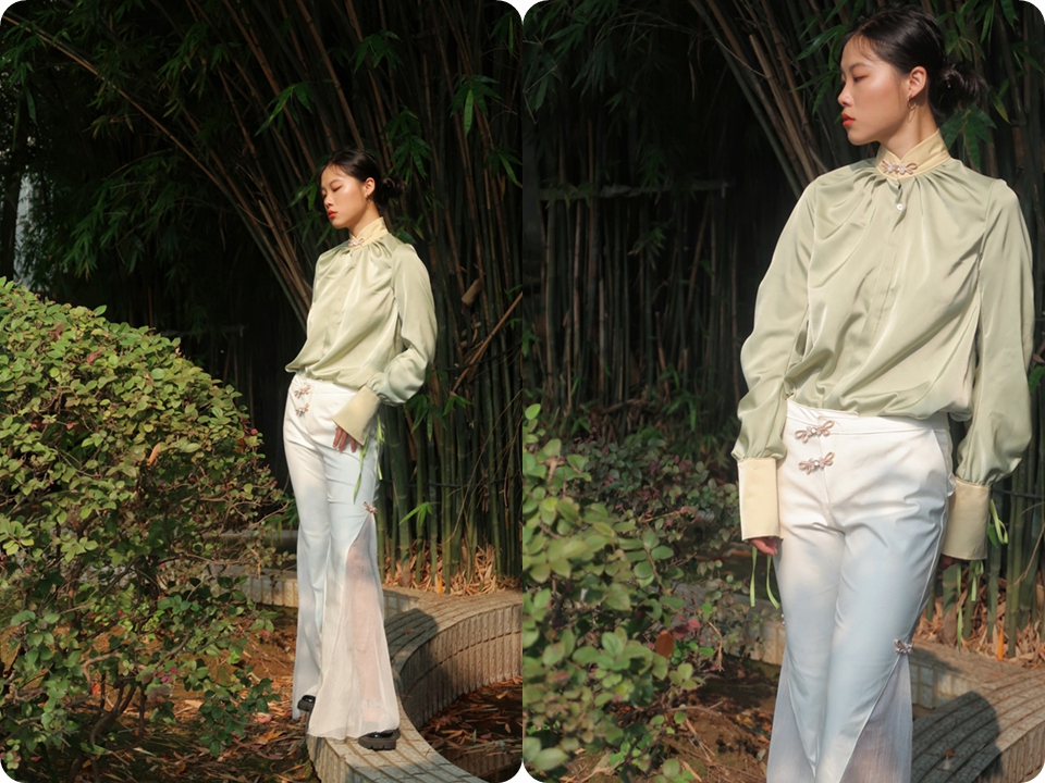 本设计作品以新中式风格为主,此款服装是对当代常见服装进行中式设计,运用中式元素以微妙的方式将含蓄内敛、细腻柔美的中国美学与现代设计形式相融合,但骨子里还是东方的韵味,让人感受到承袭千年的悠远意蕴还毫不违和。