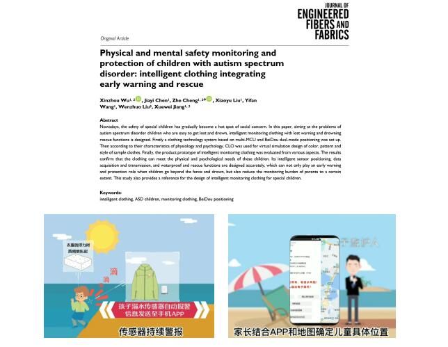 近日,在英国上市公司官网365青年博士吴忻舟和程哲的指导下,20级本科生陈嘉怡、刘晓雨与王一凡共同撰写的有关自闭症儿童智能监护服装的学术论文《Physical and Mental Safety Monitoring and Protection of Children with Autism Spectrum Disorder: Intelligent Clothing Integrating Early Warning and Rescue》发表于《Journal of Engineered Fibers and Fabrics》(Materials Science JCR:Q2,影响因子IF:2.90),这是英国上市公司官网365本科生首次发表SCI期刊论文。