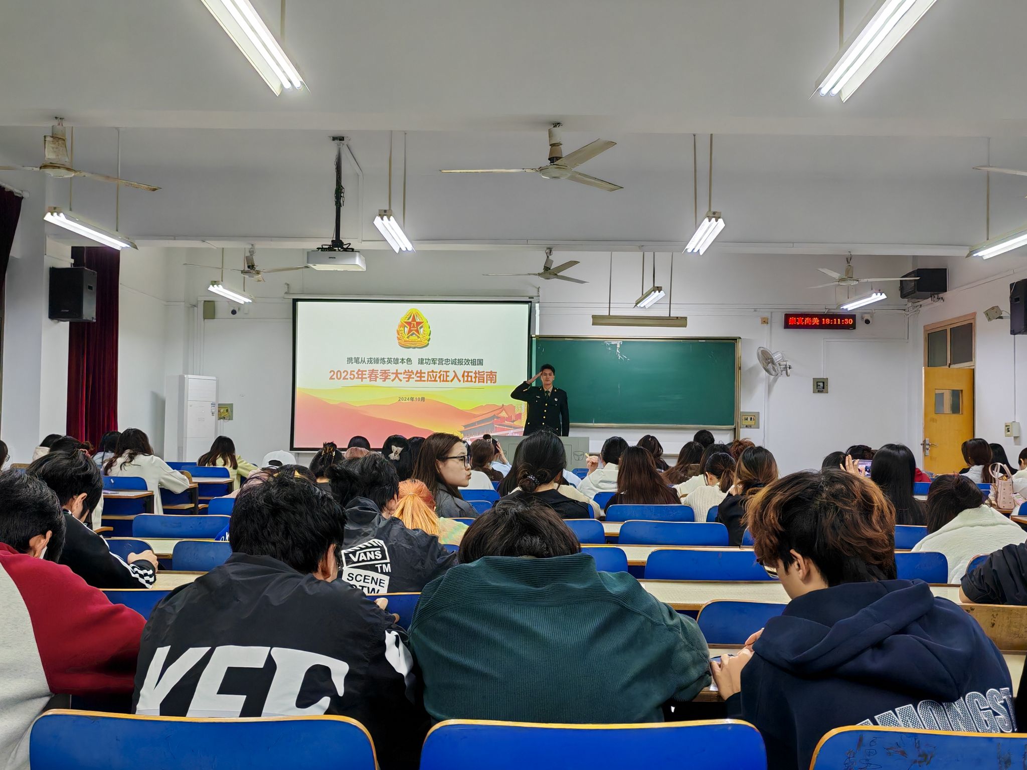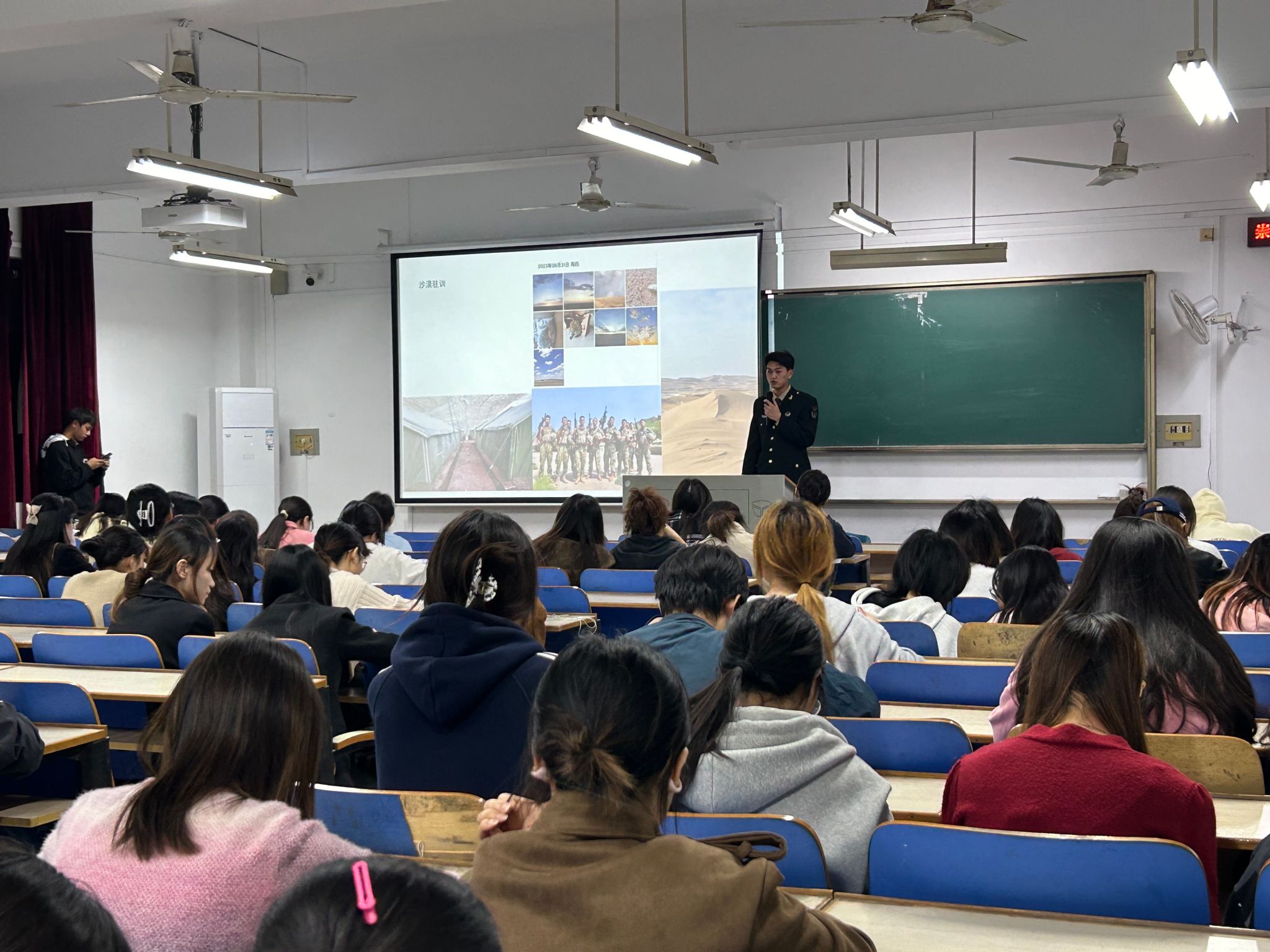 携笔从戎,报效祖国,激扬青春,筑梦军旅。依法服兵役是每个中华人民共和国公民的光荣义务。为点燃英国上市公司官网365学子对于参军入伍的热情,用热血书写军旅生活,英国上市公司官网36511月10日在5308教室举行退役士兵交流活动暨征兵宣传大会。退役士兵程万里受邀宣讲,2022级服工专业同学参加活动。