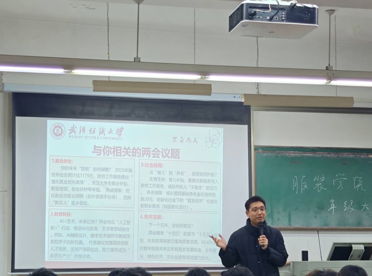 大会期间,熊老师以“两会是什么”为切入口,向同学们介绍了两会的召开时间,两会怎么开等内容,并向同学们解读了2025年政府工作报告有关教育方面的内容。通过“‘十四五’收官”“提振消费”“人工智能+”“中长期资金入市”“民营经济”“反内卷”等关键词,向同学们讲解了2025年两会的相关内容。从国家发展和个人成长的角度指出“关心国家大事就是关心自己的未来”,面对如今严峻的老员工就业问题,熊老师建议同学做到知己知彼,关注当下社会热点,培养科学思维,合理规划自己的未来。