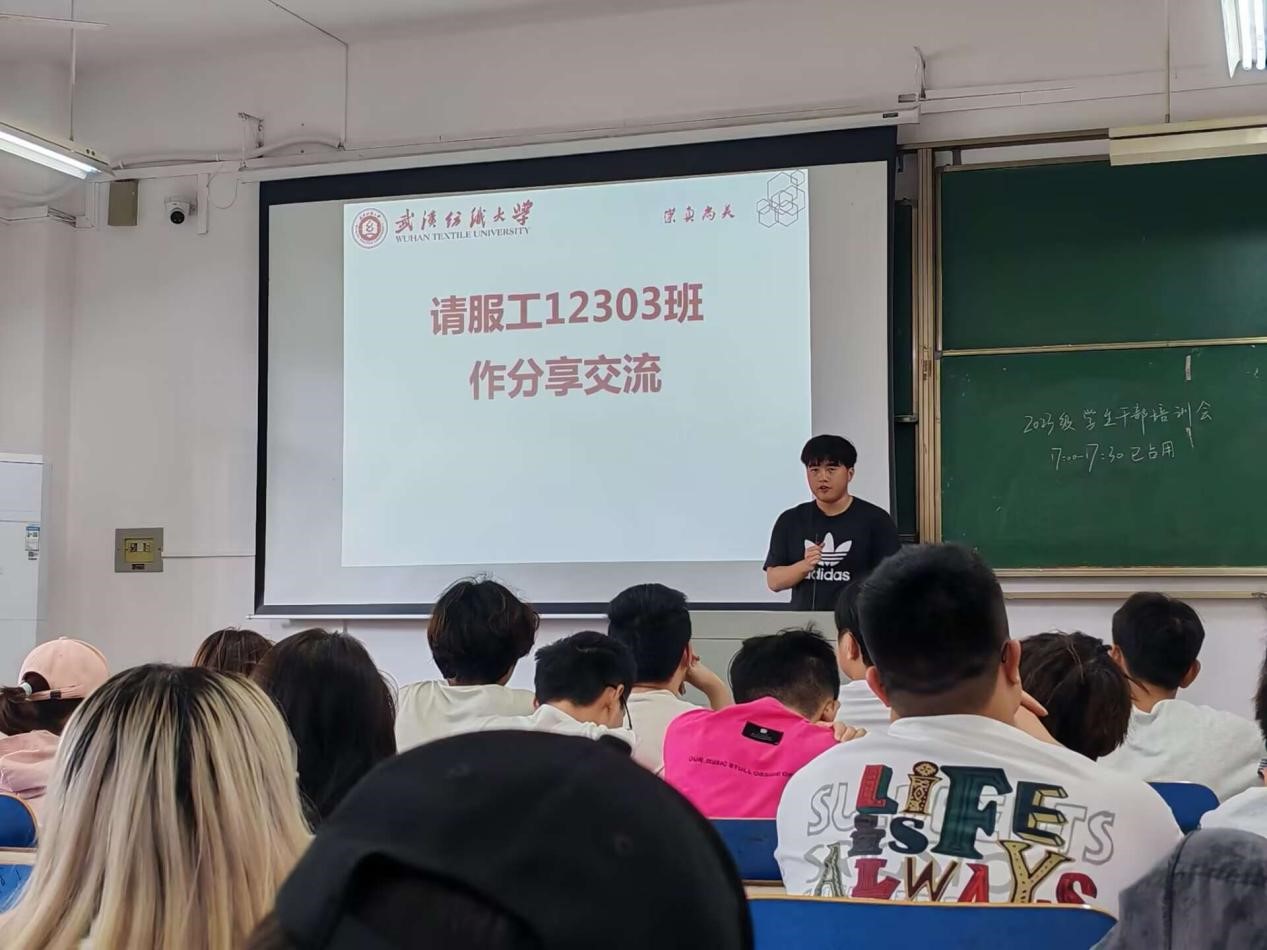 服工12303班肖啸寒作为班委代表发言,与大家分享班级管理的创新举措,首先他分享了课堂出勤率管理,寝室查寝效率优化的具体方式方法,随后介绍了班级内部推行“寝室长责任制”,通过线上实时上传查寝结果,并调动同学积极性。最后呼吁全体班委、寝室长积极行动,共同参与员工工作,配合公司工作安排,为平安校园建设贡献服装力量。
