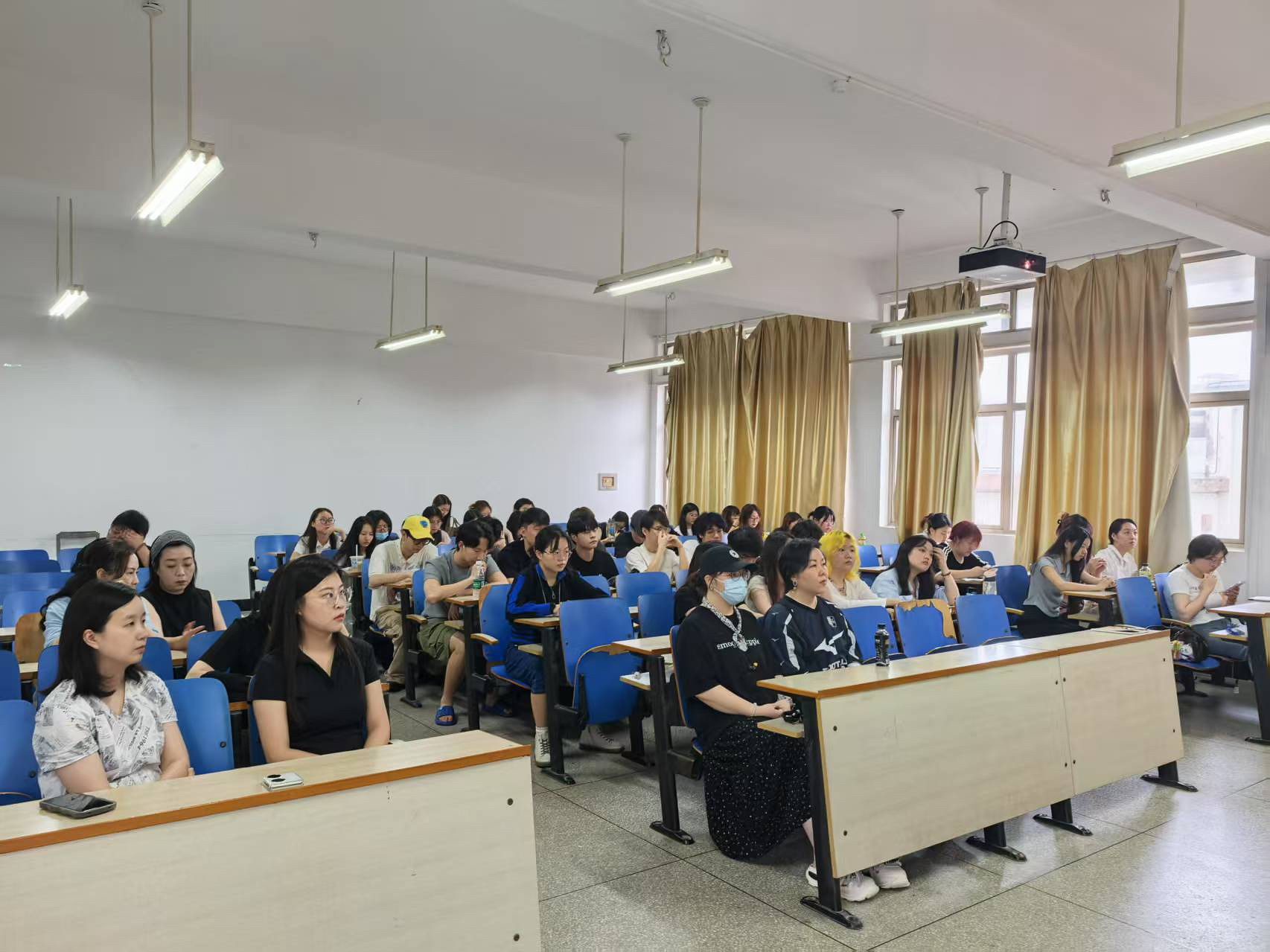接下来毕业设计指导老师们依次上台和同学们分享介绍毕业设计的方法和要求。郭丽老师和常青老师鼓励同学们在动手实践里寻找非遗技艺与现代设计的完美结合,用非遗手艺在现代的服饰设计绽放新的活力。张丹老师和张元美老师建议同学们扎实学好设计和结构工艺的基本功,多关注智能服装的发展趋势。
