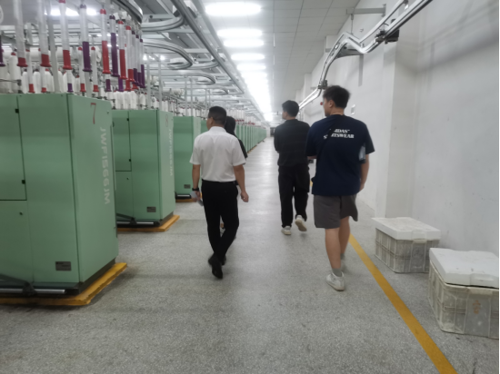 共青城纺织服装产业涵盖纺纱、面料、成衣全产业链,以羽绒服设计制造为核心。在与企业负责人、一线员工的交流中,调研团队详细了解了当地纺织服装企业的生产经营现状、面临的具体困难以及转型升级的具体实践。江西锦恒纺织作为纺纱业的代表,拥有数十台精密纺纱设备,日产纱线3.45吨,却面临与新疆同业竞争压力大的难题;乾钰、奥博特等成衣企业以代加工为主,乾钰年产能超30万件,羽绒服占比 70%,却受“淡季稳工、旺季抢人”的用工波动影响。鸿瞾服装发力跨境电商,走“薄利多销+定制化”路线;旭东纺织打通“面料-服装-销售”全产业链,试图突破代加工低附加值困境;互利纺织部署54台数字化喷水织机,实现“1人管多机”,智能化转型初见成效。