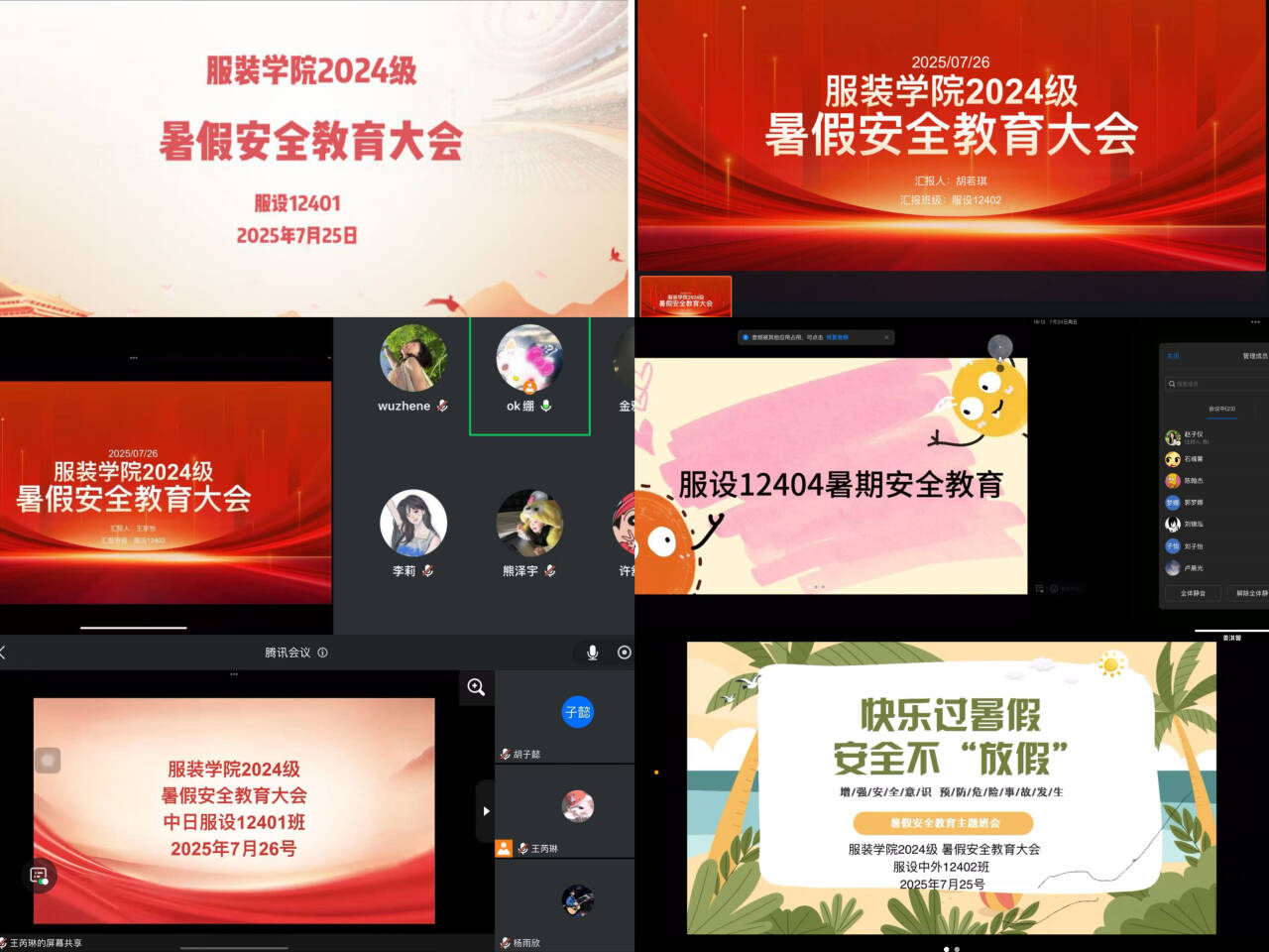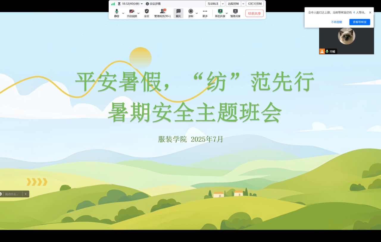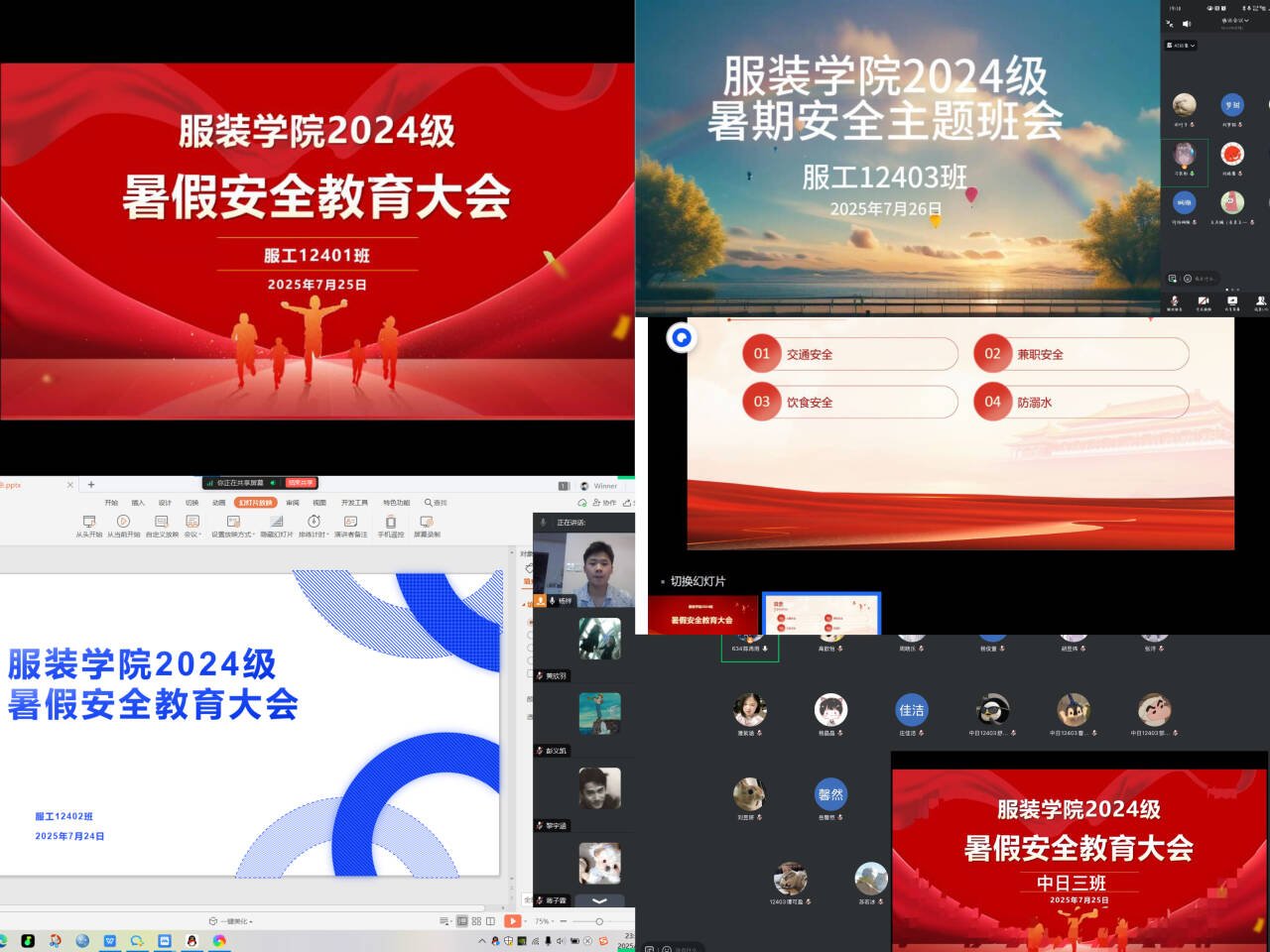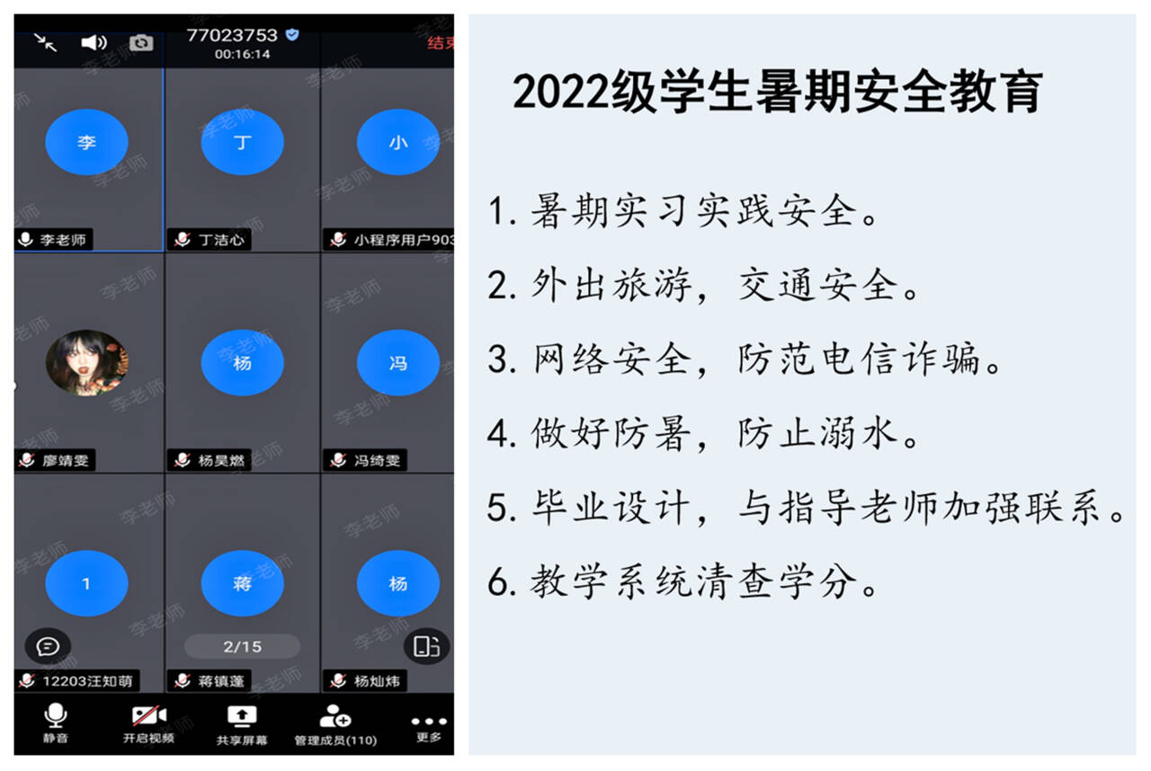 研究生辅导员夏菡通过线上会议的形式,着重提醒同学们在出行时要严格遵守交通规则,注意交通安全;在参加实习实训及社会实践等活动时,务必提高警惕,保障自身人身与财产安全。此外,会议还专门针对夏季高发的安全风险,开展了防溺水和防电信诈骗专题教育,帮助同学们进一步提升安全意识和应对各类风险的防范能力。23级服设、服工专业辅导员夏书明提醒员工假期在家注意防范电信诈骗,并结合近期突发典型案例教训,强调了外出实习和社会实践要格外注意人身、财产安全,实习实践期间与家长、老师、同学保持密切联系。由于近期天气炎热,提醒同学严禁在不熟悉、有安全风险地方游泳,防止溺水。最后,期望同学们利用假期时间,规划大三学业和职业目标。