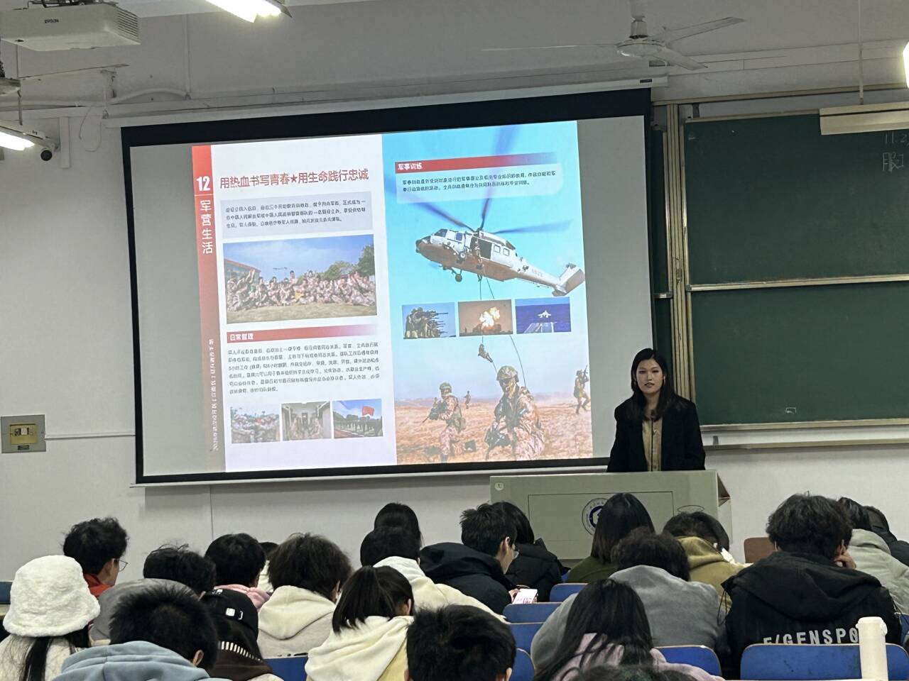 11月24日,英国上市公司官网365在综合楼108举办2026年春季征兵政策宣讲会,公司武装部征兵入伍宣讲员、22级优秀退役士兵杨佳慧担任主讲,2023级同学参加。