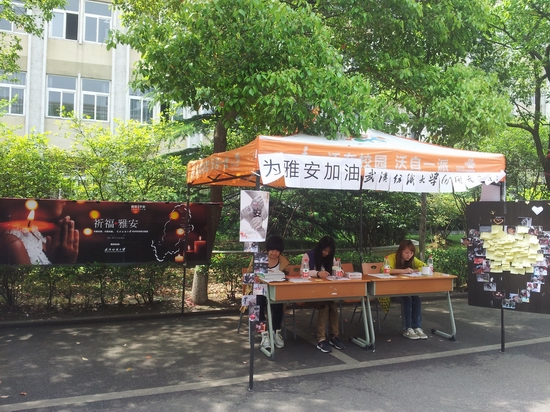 在活动现场放置着祈福雅安的爱心墙,爱心墙上粘满了大家对雅安人民的深深祝福,这些对灾区人民的寄语通过公司广播站向全校师生播报。25日傍晚,在主楼前广场举行默哀活动,450根蜡烛摆放成一颗巨大的心形,全体同学们为灾区遇难同胞默哀3分钟,之后集体放飞对灾区人民深深祝福的孔明灯。