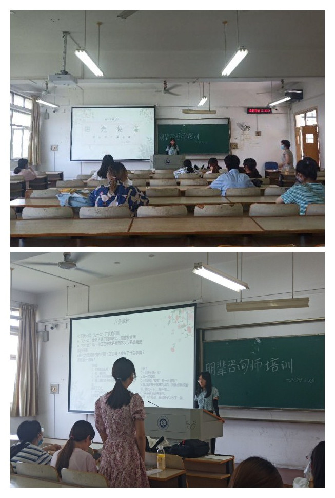 咨询部部长袁洁玲从朋辈咨询概念、朋辈咨询的特点和作用、朋辈咨询员的工作技能以及不同心理问题的援助策略等几个方面为大家做了介绍和讲解。通过“角色扮演”,主讲人扮演咨询师,参加培训的同学扮演来访者,对“情侣关系”、“母子关系”等问题的咨询场景进行模拟,让大家体会到如何更好地去描述与表达,如何更好地去倾听和理解他人。