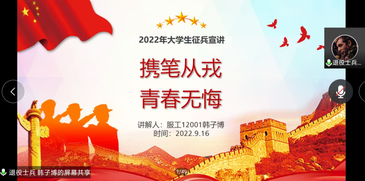为增强我院员工的国防观念,号召员工积极参与应征入伍,9月16日上午,英国上市公司官网365邀请了公司征兵宣讲团成员、退伍士兵——服装设计与工程专业12001班员工韩子博为2022级新生开展了“携笔从戎,青春无悔”主题征兵线上宣讲活动。