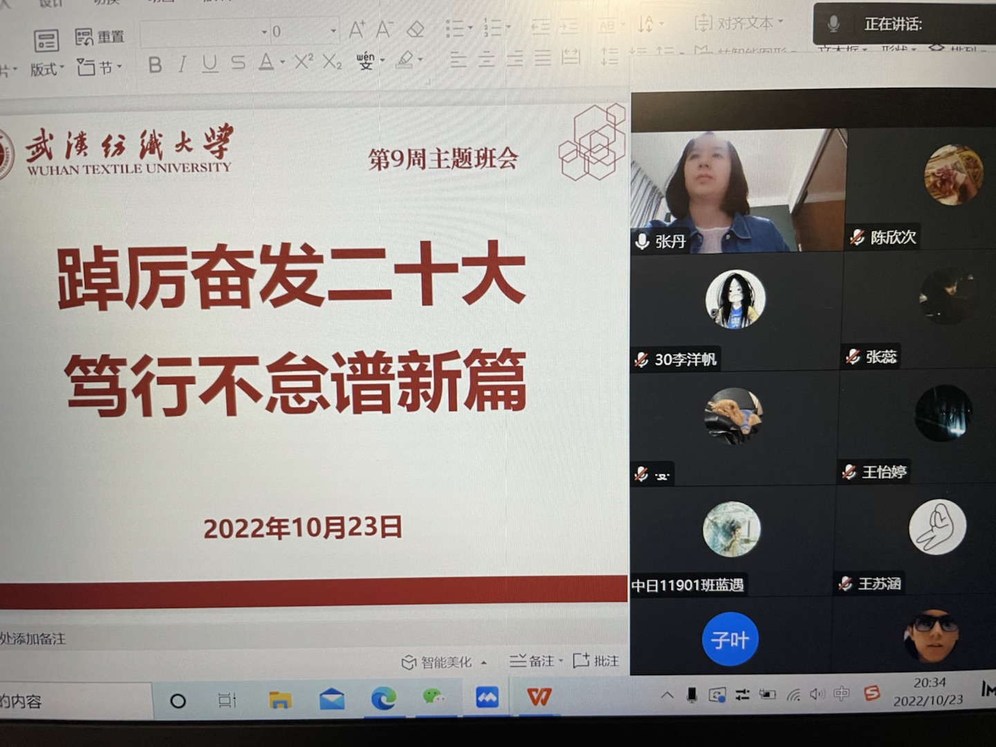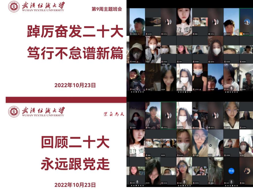 10月23日晚,服装公司召开了晚点名主题班会,各年级辅导员、班主任以“踔厉奋发党的二十大,笃行不怠谱新篇”为主题,组织同学们一起学习习近平同志代表第十九届中央委员会向大会作报告。学习党的二十大主题、中心任务、战略安排、重大原则、首要任务等内容,梳理回顾学习了习近平总书记历次会议对青年的殷切寄语,引导同学们立志做有理想、敢担当、能吃苦、肯奋斗的新时代好青年,让青春在全面建成社会主义现代化强国的火热实践中绽放绚丽之花。