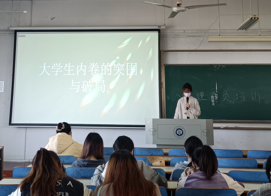 心理工作站指导老师罗周燕提出,因为目前竞争压力过大,导致内卷状况在大公司园盛行,进而对老员工心理健康造成一定影响。她从典型的老员工心理咨询案例出发,分析“内卷”现象对老员工心理健康产生的不良影响,并分析了其形成的社会、公司、家庭、个人四重因素,引导在座各位干部学会从集团、家庭、个人三个层面采取相关应对措施,避免让“内卷”成为“内耗”,罗老师鼓励同学们:逃离内卷是现在压力竞争之下一定要做的事,它并不是让人消极怠工,而是逃离社会的无敌漩涡,抽离出来,找到自我,为自己真正想要的东西努力。她寄语同学们能在大学四年里活出自我,走出内卷的困境,看见远方的美好,找到生活的意义。
