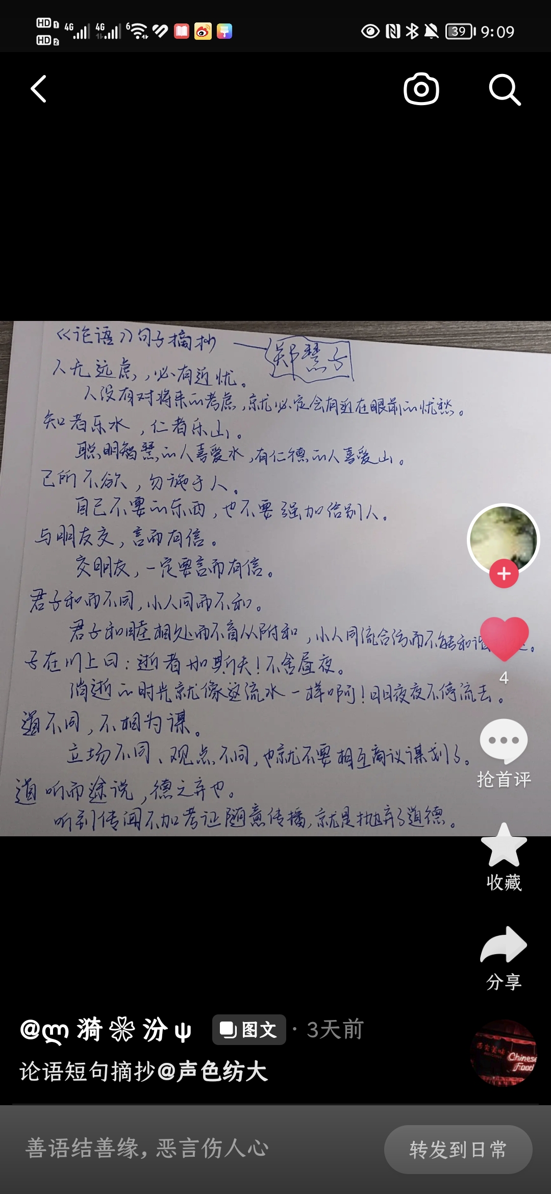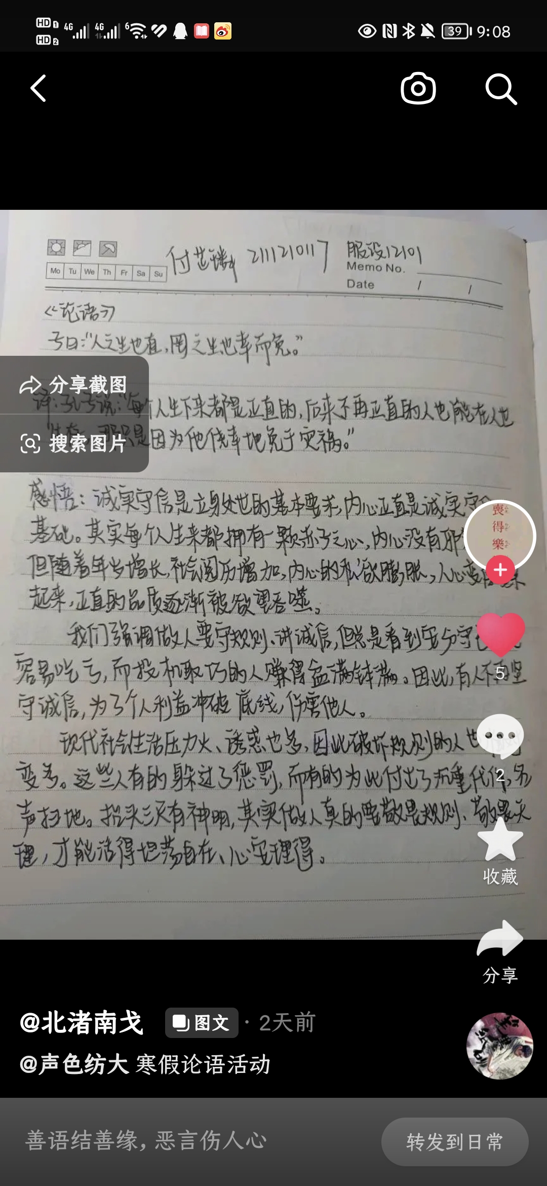 另外,这一周,同学们也已经开始在自己抖音平台上发布《论语》打卡视频作品,形式多样,内容丰富多彩,看得出,不少同学都花了心思,下了功夫。