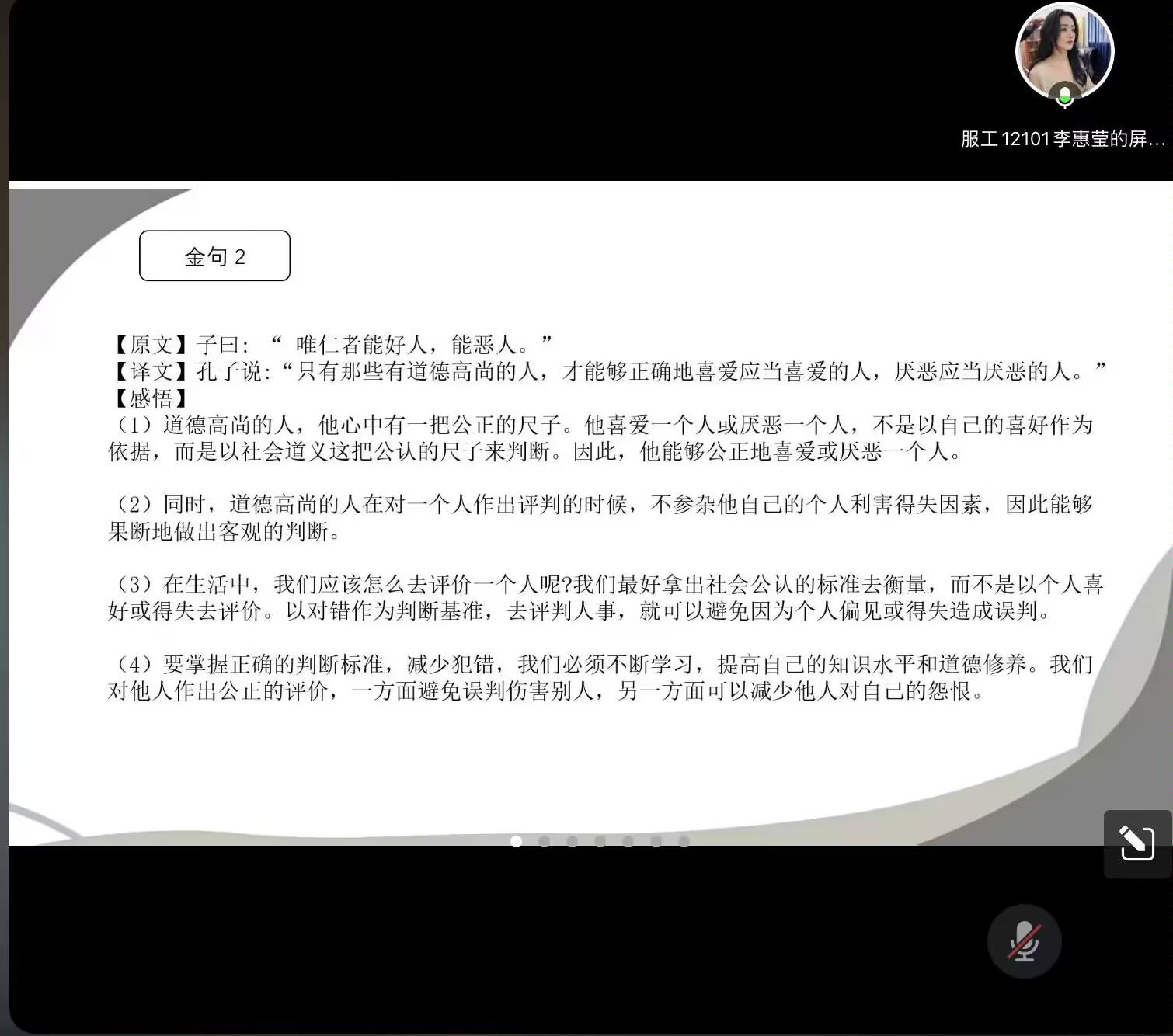 第五组的六位同学各自分享论语中君子的"德""仁""信""礼",并充分阐明其涵义,立意新而使人深刻。