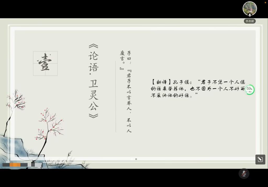《论语》乃集中国文化万千于一身,当代世界最经典之儒学,中国儒学大师之言行。其每一句话,都蕴含着儒家智慧,北宋政治家赵普曾有:“半部《论语》治天下”之说,南宋朱熹更是将《大学》、《论语》、《孟子》、《中庸》合为“四书”,使之在儒家经典中的地位日益提高。如今的学子们读到了《论语》的仁义礼智信,更将其传播,让更多人看见《论语》的魅力。12月25日周日下午15:00,公司“声色纺大”诵读协会在线上组织32位同学,开展了第二次《论语》金句品读讲解活动,现场反响热烈。