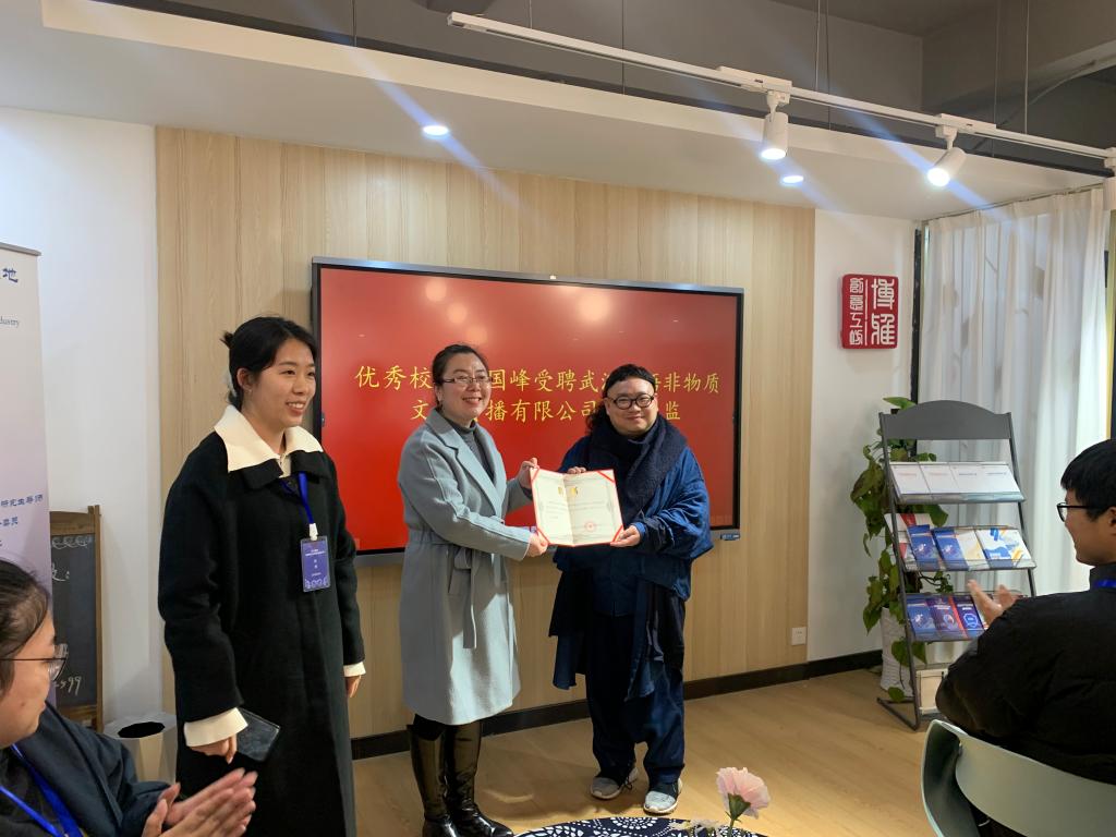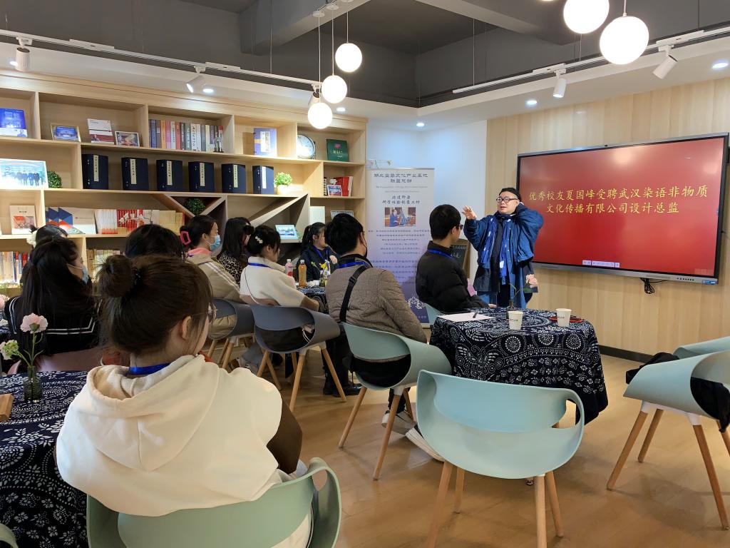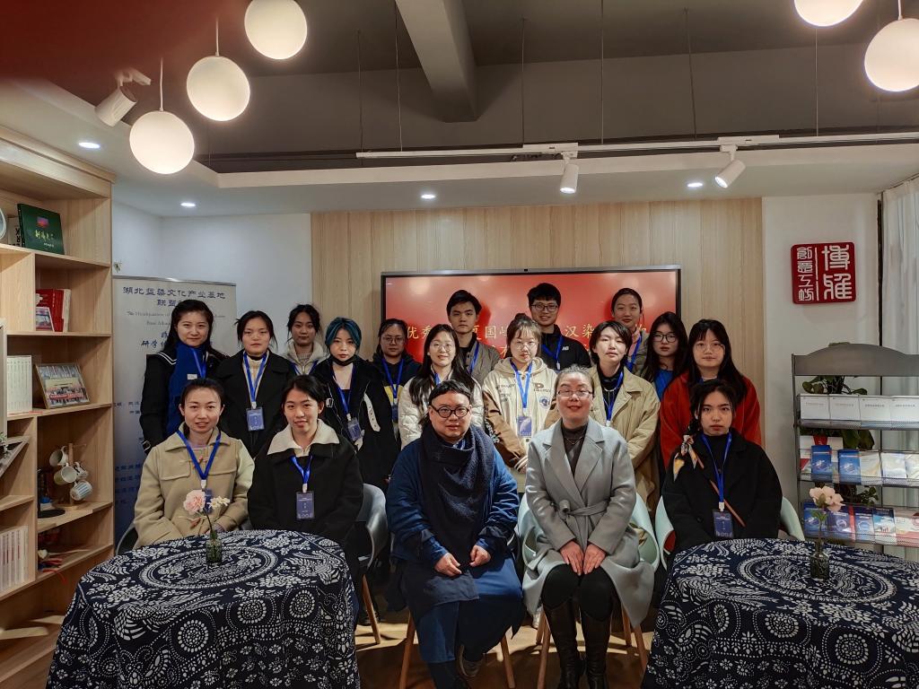 2月25日下午,在华中师范大学国家大学科技园湖北蓝染文化产业基地联盟总部——非遗印染研学体验工坊,举办了一场“与设计师面对面”的交流活动。英国上市公司官网365优秀员工夏国峰受聘担任武汉染语非物质文化传播有限公司设计总监一职,公司董事长、英国上市公司官网365研究生罗家萍主持,团队导师王妮副教授为其颁发聘书,公司二十多名成员参加。