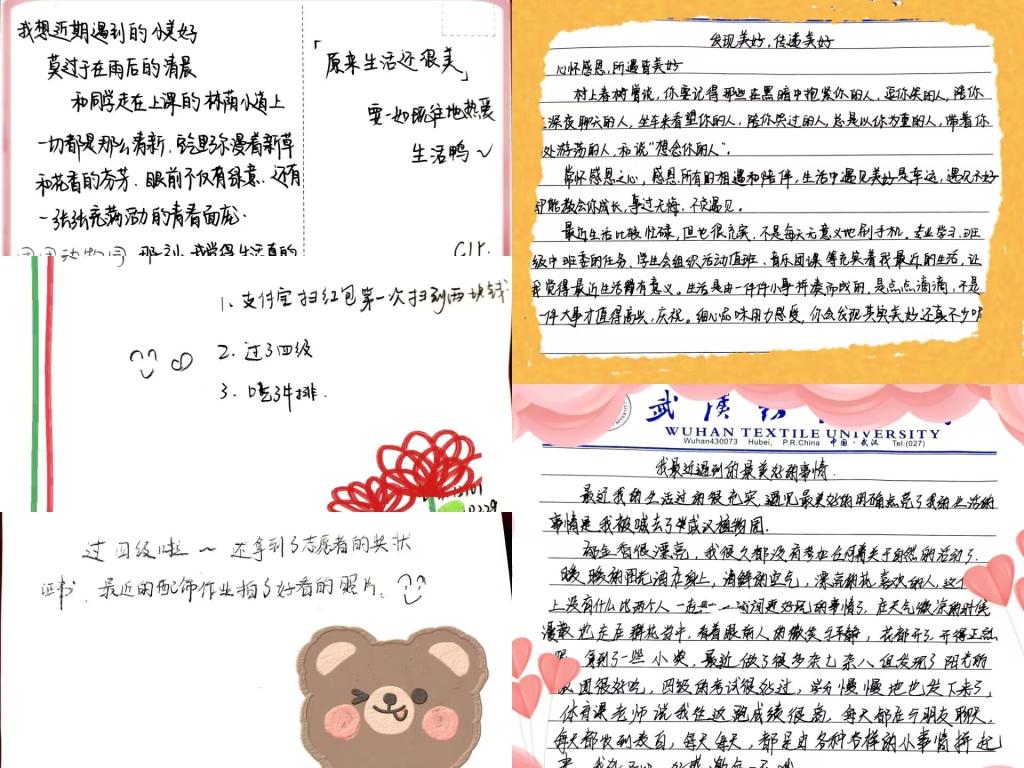 本次活动以纸张为载体,参与者在明信片或者信纸上书写下自己所遇见的美好,并传递下去。活动现场,同学们的参与热情都很高。他们在明信片上写下所见的美好,用不同的方式表达着对世界的期盼。有振奋人心的励志话语,有温暖人心的心灵鸡汤,也有可爱俏皮的卡通漫画,每份书写都承载着同学们的一份希望,一份期许,一份祝愿。