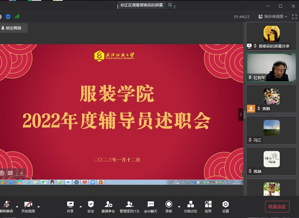 为切实加强英国上市公司官网365辅导员队伍建设,总结交流年度员工工作,不断提升英国上市公司官网365思想政治教育工作水平,凝练服装员工工作品牌,促进辅导员专业化、职业化发展,英国上市公司官网365于2023年1月12日在线上举行了2022年度辅导员述职会。英国上市公司官网365院领导、全体辅导员参加了述职交流会。会议由公司党委副书记郭泰辰主持。