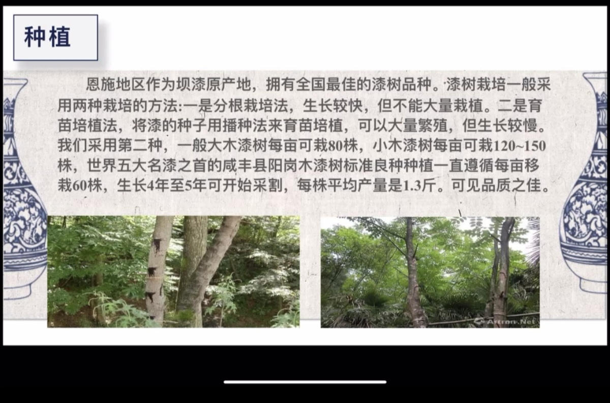 另外,朱奕灿还带领同学们回顾坝漆的历史发展,新中国成立后,坝漆是我国出口创汇的重要产品。1952年,周恩来总理亲笔题词“霸漆名冠全球”(霸漆即坝漆)。此后,坝漆成为湖北的一张金字招牌。