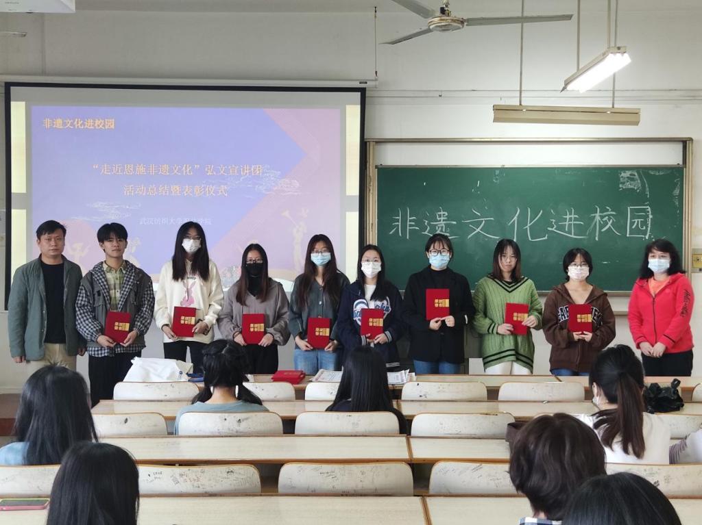 活动的最后,宣讲团的指导老师尹俊华和张智梅一起为在“走近恩施非遗文化”社会实践系列活动工作中努力传播优秀的非遗文化弘文宣讲团讲师团成员及践行志愿精神的“优秀志愿者”颁发荣誉证书。