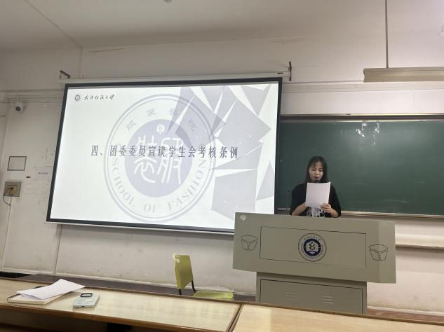 第四项议程,主席团成员祝煜宣读团委员工会规章制度及考核条例。
