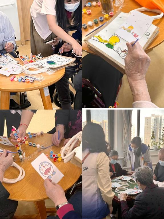 活动伊始,志愿者指导福利院的老人完成独具个性的涂鸦袋。老人们充分发挥自己的想象力和创造力,在涂鸦袋上表达自己的想法和感情,用心制作属于自己的手工作品。