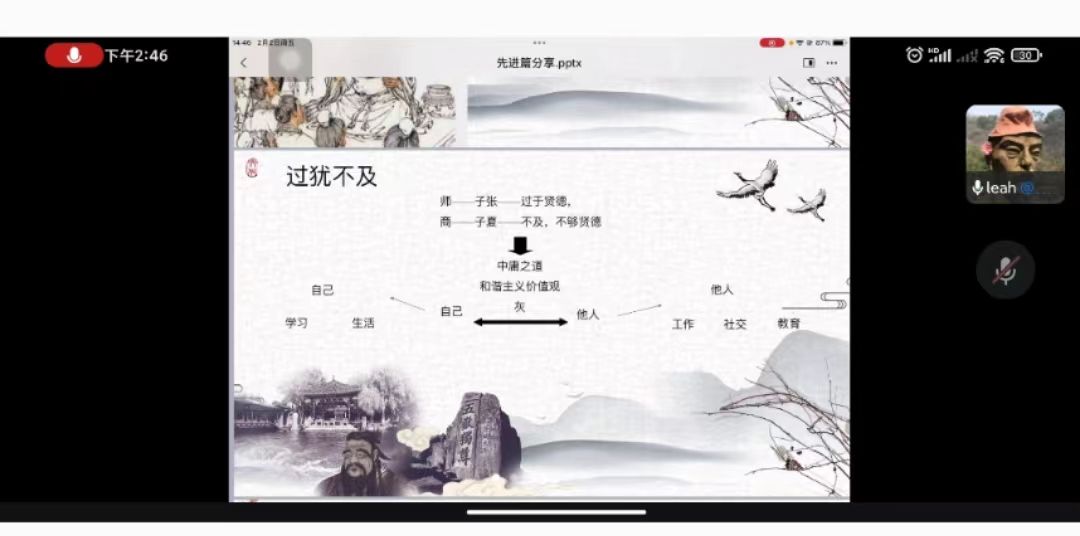 “近者悦,远者来”,本次寒假学习活动也吸引了很多新同学,研究生2311班的李颖便是其中之一,她分享了自己对“中庸之道”的感悟,结合日常的生活体验,生动讲述了“中正平和,因时制宜、因事制宜”的处世智慧。