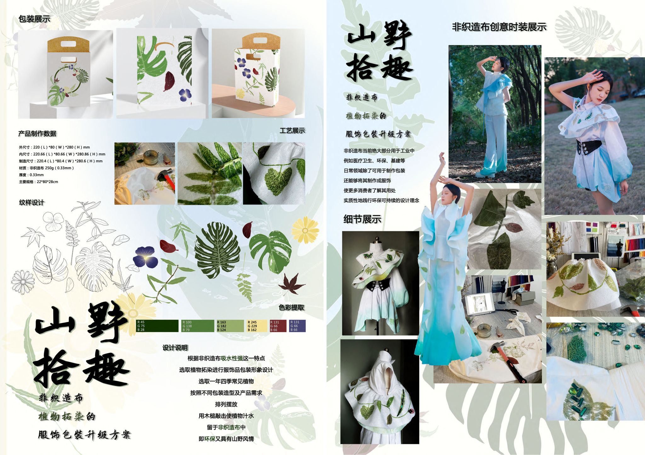 团队成员学以致用,积极与非织造材料开发厂家对接,了解业内最新研发的非织造布材料的特性,对佰家利非织造布在服装及时尚包装产品中的创新设计与应用进行了大胆的探索研发,提炼其品牌非织造布独特的物理特性和审美特征,结合创意思维与多元设计方案。在设计实践环节,团队成员通过植物敲拓染、手工喷染等工艺进行创意表达,实现了从材料到服装的转化。这些作品不仅展示了非织造布在时尚领域的多样性和可能性,还体现了其低碳环保、可持续的设计理念。