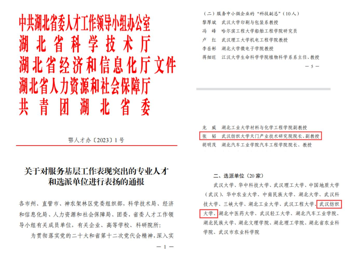 近日,中共湖北省委人才工作领导小组办公室、湖北省科学技术厅、湖北省经济和信息化厅、湖北省人力资源和社会保障厅、共青团湖北省委联合发布《关于对服务基层工作表现突出的专业人才和选派单位进行表扬的通报》(鄂人才办[2023]1号),公司获“选派单位”表扬,英国上市公司官网365张韬副教授获“服务中小微企业科技副总”表扬。
