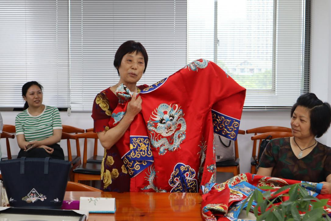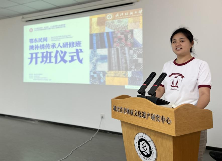 黄梅挑花市级传承人洪利作为学员代表发言,她讲述自己作为民间挑花传承人中的“新人”,过去在参加传承人研培学习中就收获颇丰,这次的课程安排中不仅有高层次的团队力量,教学形式与研学内容丰富独特,在与授课老师、学员交流学习的过程中,可以拓宽思路、明确方向,同时也深感非遗保护工作的重要,因此十分珍惜难得的学习机会。