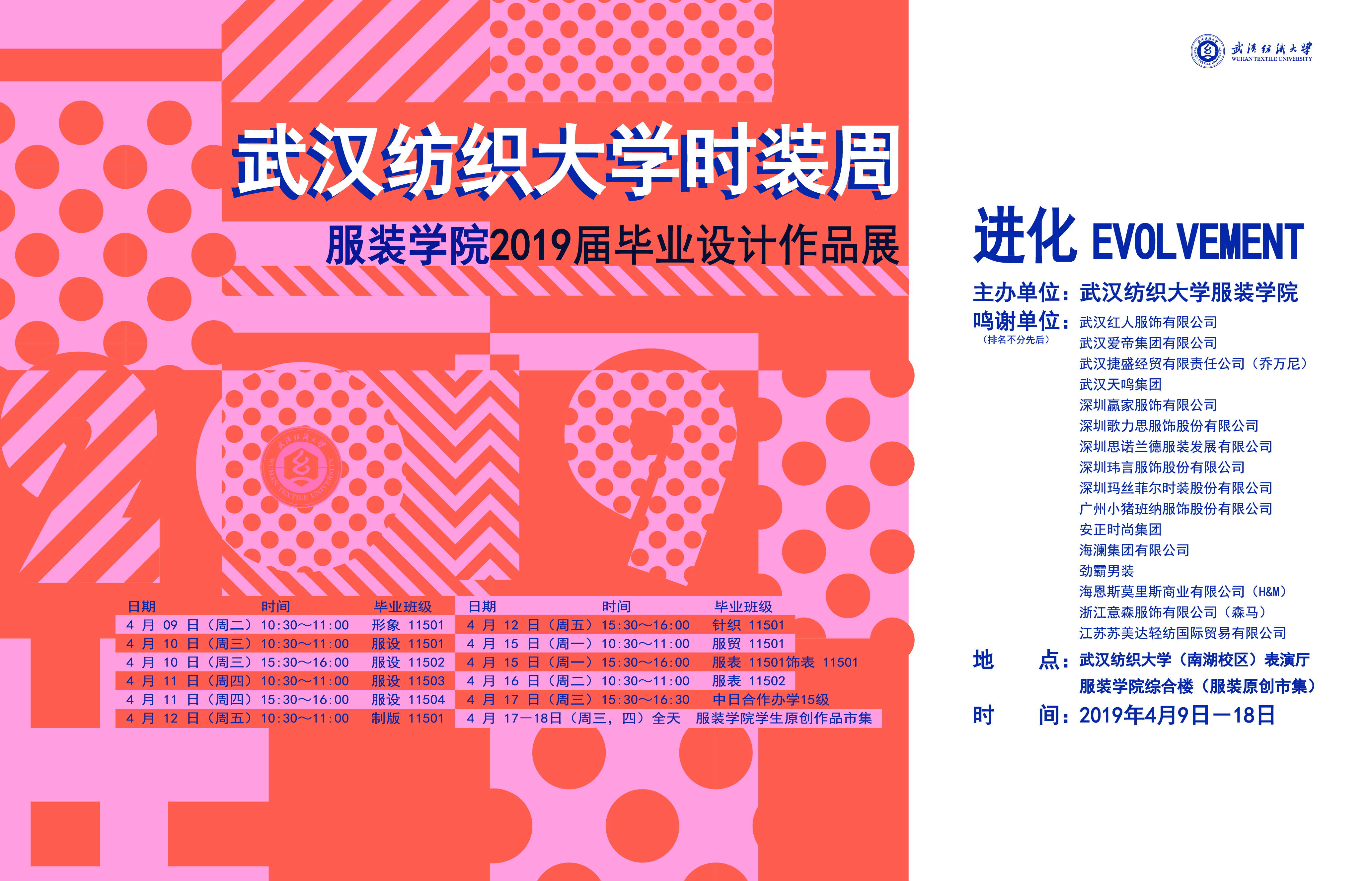 传播时尚文化,弘扬时代精神。2019英国上市公司官网365时装周暨2019届毕业生毕业设计作品展将于2019年4月9日在南湖校区表演厅启幕。