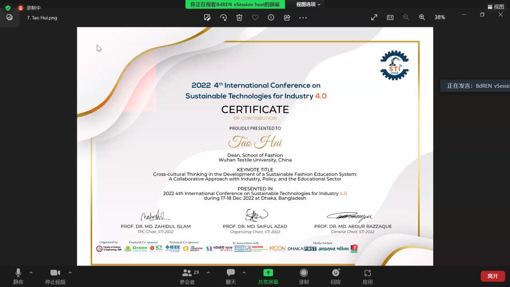 In the speech, Professor Tao Hui especially emphasized that the reason for putting forward the concept of intercultural is to emphasize sustainable development in the context of globalization and to ‘thinking outside the silo’, not only across languages, countries, and regions but also across disciplines and historical nodes, through the establishment and formation of cross-cultural thinking, break self-management and innovate development models, which is also the focus of sustainable development of global fashion. Professor Tao Hui’s speech motivated the interest of the participants, and during the question-and-answer session, she interacted online with several professors and the Vice-chancellor from Green University of Bangladesh Professor Dr. Md. Golam Samdani Fakir. He acknowledged his gratitude to Professor Tao Hui and appreciated his delightful visit to Wuhan Textile University in 2014. Finally, the conference also awarded Professor Tao Hui a speech certificate.